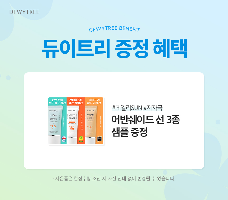 듀이트리(DEWYTREE)는 피부 유해 성분을 배제한 안전하고 건강한 성분, 소비자가 원하는 기능에 대한 확실한 효과, 사람과 지구를 생각하는 마음까지 담은 제품을 만듭니다.