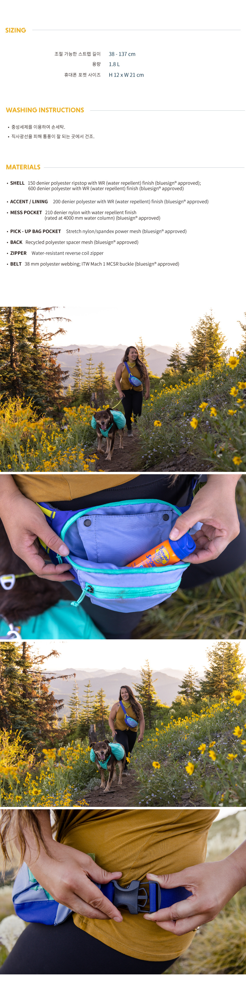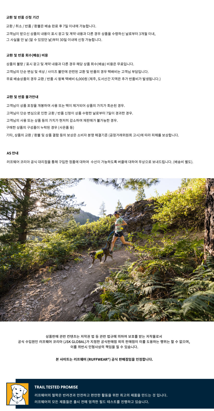 러프웨어(RUFFWEAR)는 그 이름만으로도 애견용품을 대표하는 최고급 브랜드로 미국 오리건주 밴드에 위치했습니다. 러프웨어의 철학은 개와 사람이 동료애를 느끼며 아웃도어 활동을 안전하고 편안하게 할 수 있는 최고급 아웃도어 애견용품을 만드는 것이며, 이를 위해 제품의 디자인, 소재를 그 목적에 맞게 설계/제작하고 있으며 지속적인 제품 개발을 통해 최고의 애견용품 업체로의 위상을 굳건해 하고 있습니다.