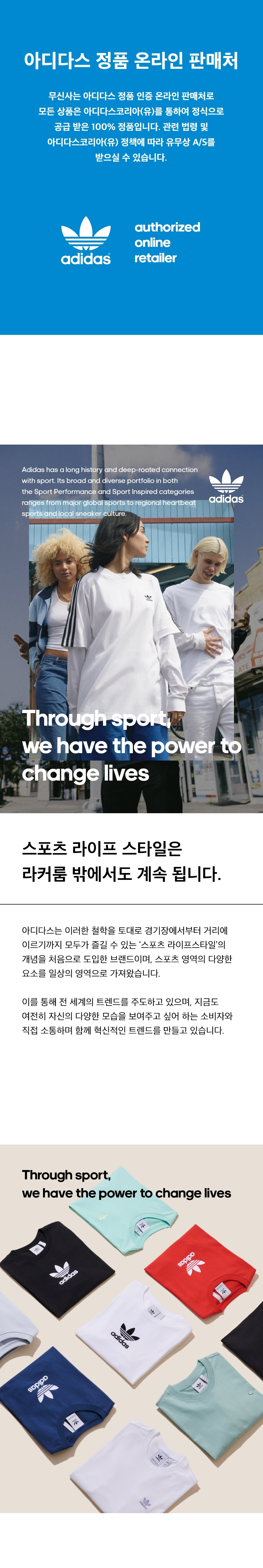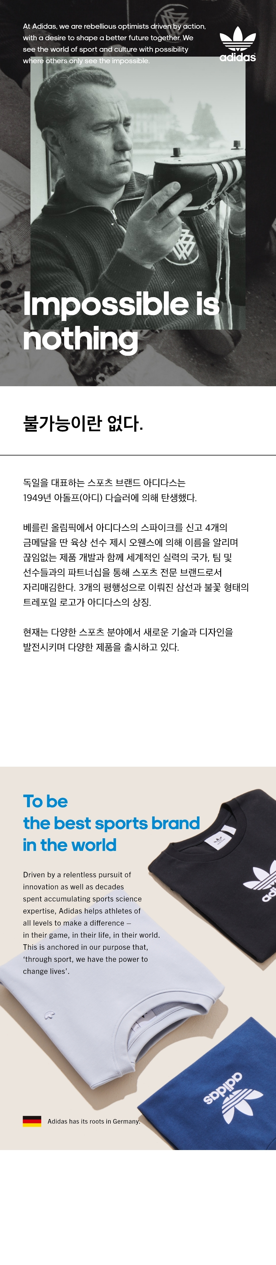 스포츠 라이프스타일은 라커룸 밖에서도 계속됩니다. 1920년부터 독일의 헤르초게나우라흐에서 스포츠 슈즈를 만들던 아디다스(ADIDAS)는 이러한 철학을 토대로 경기장에서부터 거리에 이르기까지 모두가 즐길 수 있는 '스포츠 라이프스타일'의 개념을 처음으로 도입한 브랜드입니다. 스포츠 영역의 다양한 요소를 일상의 영역으로 가져오는 아디다스는 이를 통해 전 세계의 트렌드를 주도하고 있으며, 지금도 여전히 자신의 다양한 모습을 보여주고 싶어하는 소비자와 직접 소통하며 함께 혁신적인 트렌드를 만들고 있습니다.