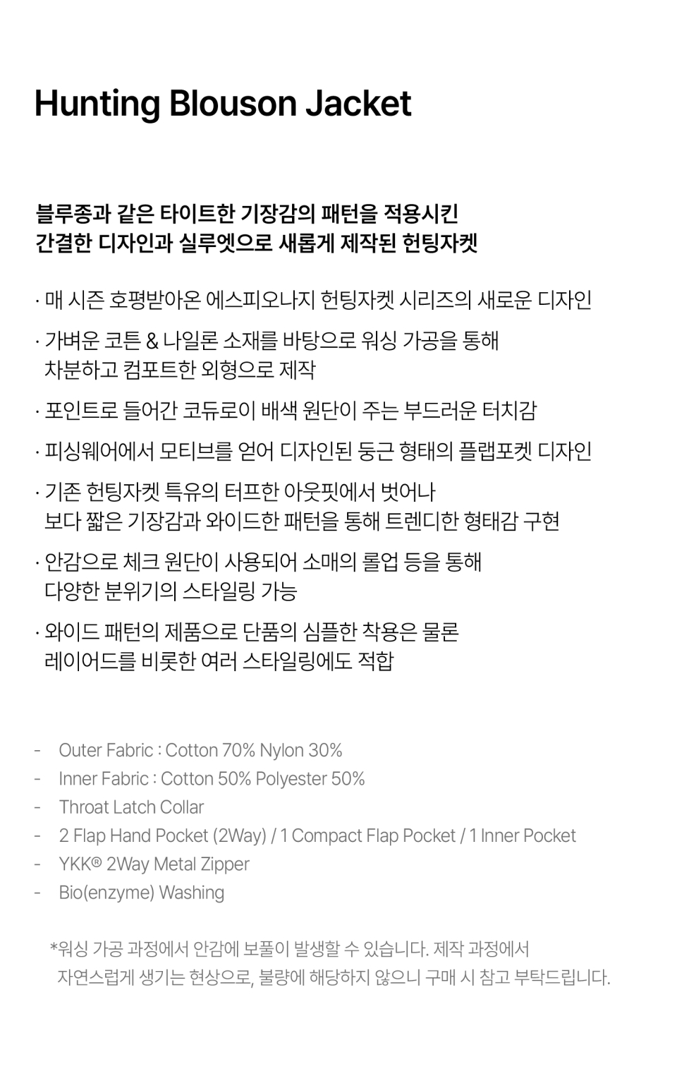 에스피오나지(ESPIONAGE)는 '밖을 보다' '숨겨져 있는 것을 발견한다'는 의미의 고대 프랑스어 ESPIRE에서 유래한 말로 지금은 타국의 비밀 정보를 수집하는 첩보 활동을 뜻하기도 합니다. 첩보 활동의 의미가 적진에서 은밀히 적들의 정보를 빼오는 것을 말하는 것처럼 에스피오나지가 만드는 아이템에는 숨겨져 있는 것을 찾아내는 과정을 포함하고 있습니다. 클래식, 밀리터리, 아웃도어 등 이미 만들어져 있는 의복을 베이스로 우리가 중요하게 생각하는 원단과 부자재, 기술, 핏 등의 요소들을 정확하게 탐구하고 수집해 조합, 재정의 혹은 재해석된 결과물을 만들고자 합니다. 사전적인 의미의 에스피오나지가 가지는 부정적인 첩보 활동의 이미지가 아닌 첩보 활동의 과정, 즉 본질에 대한 탐구와 조사 활동이라는 긍정적인 느낌을 전달하려 하며 수집된 정보를 하나의 작업물로 만들어내는 일련의 과정과 그렇게 완성한 에스피오나지의 아이템을 통해 다시 만드는 과정을 다시 유추하려는 생각들 모두 에스피오나지입니다.