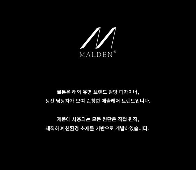 몰든(MALDEN)은 친환경 소재 사용을 목적으로, 해외 유명 브랜드의 담당 디자이너와 생산 담당자가 의기투합해 만든 애슬레저 브랜드입니다. 스포츠 웨어의 활동성에 데일리 웨어의 범용성을 두루 갖추었으며, 수백 번의 테스트 과정을 거친 품질이 보장된 제품만을 선보입니다.