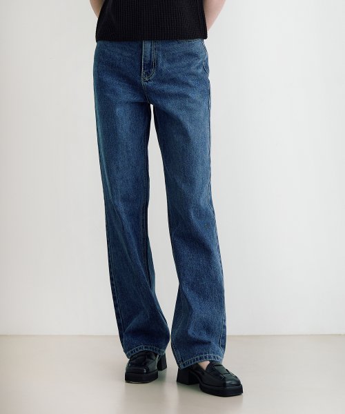 레더 라벨 워싱 와이드 데님 팬츠 - 블루