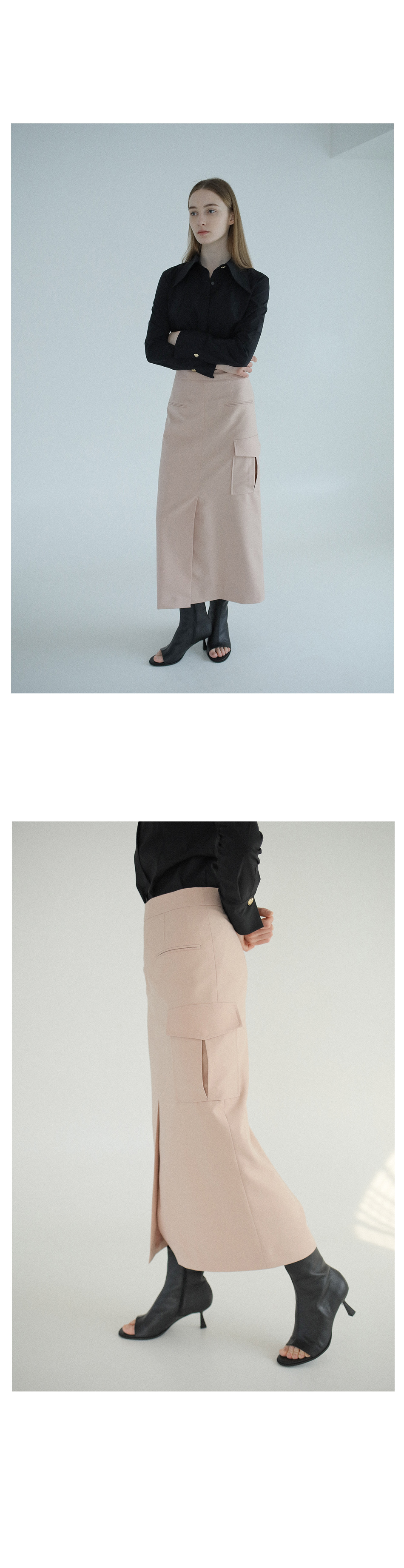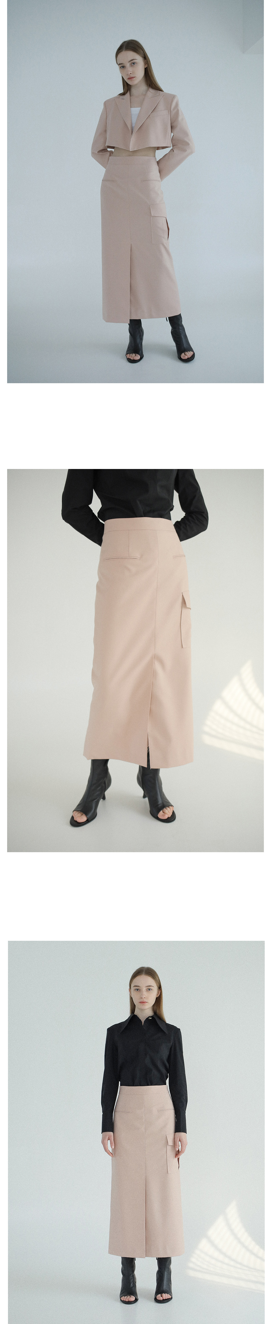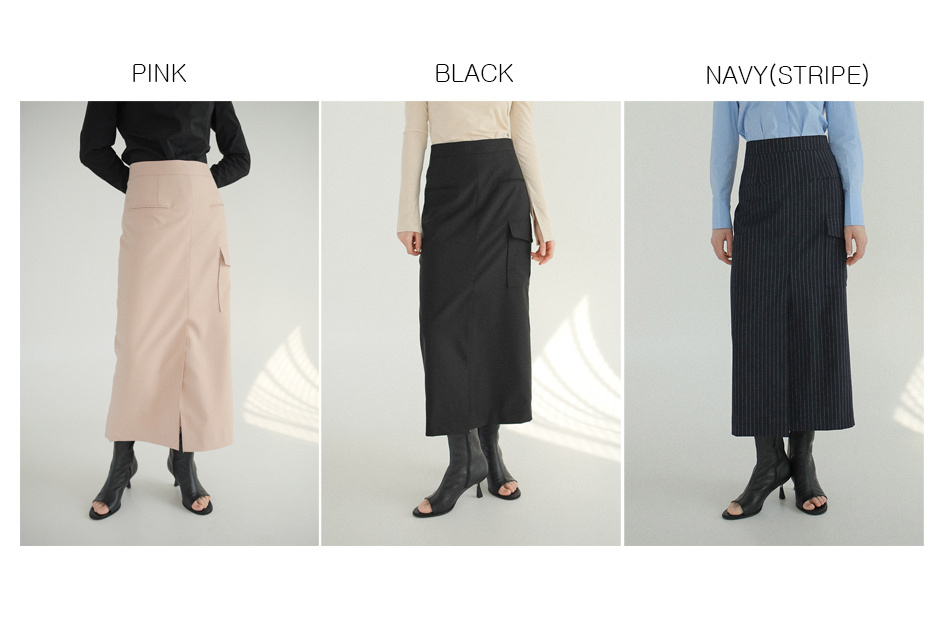 포켓 디테일로 포인트를 준 맥시 스커트입니다.