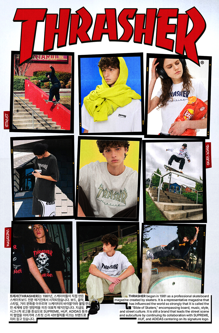 트레셔(THRASHER)는 1981년 샌프란시스코에서 동시대 가장 높은 퀄리티의 콘텐츠를 선보이며 스케이트보드는 물론 음악, 거리 문화, 스타일 등 서브컬처 신을 주도하던 케빈 대처(Kevin Thatcher), 에릭 스웬슨(Eric Swenson), 포스토 비텔로(Fausto Vitello)가 창간한 매거진입니다. '스케이터의 바이블'이라고 불릴 정도로 엄청난 팬덤을 자랑하며 대체 불가 매거진으로 자리 잡은 트레셔는 서브컬처, 스트릿 패션 신에 굳건히 자리를 잡음과 동시에 시그니처 로고 제품을 중심으로 국내외 유명 셀러브리티에게도 많은 사랑을 받았습니다. 또한 슈프림(SUPREME), 허프(HUF), 아디다스(ADIDAS) 등 꾸준히 주목받는 컬래버레이션을 비롯해 서브컬처의 발전을 위해 늘 다양한 프로젝트를 선보이며 확고한 브랜딩을 이어가고 있습니다.
