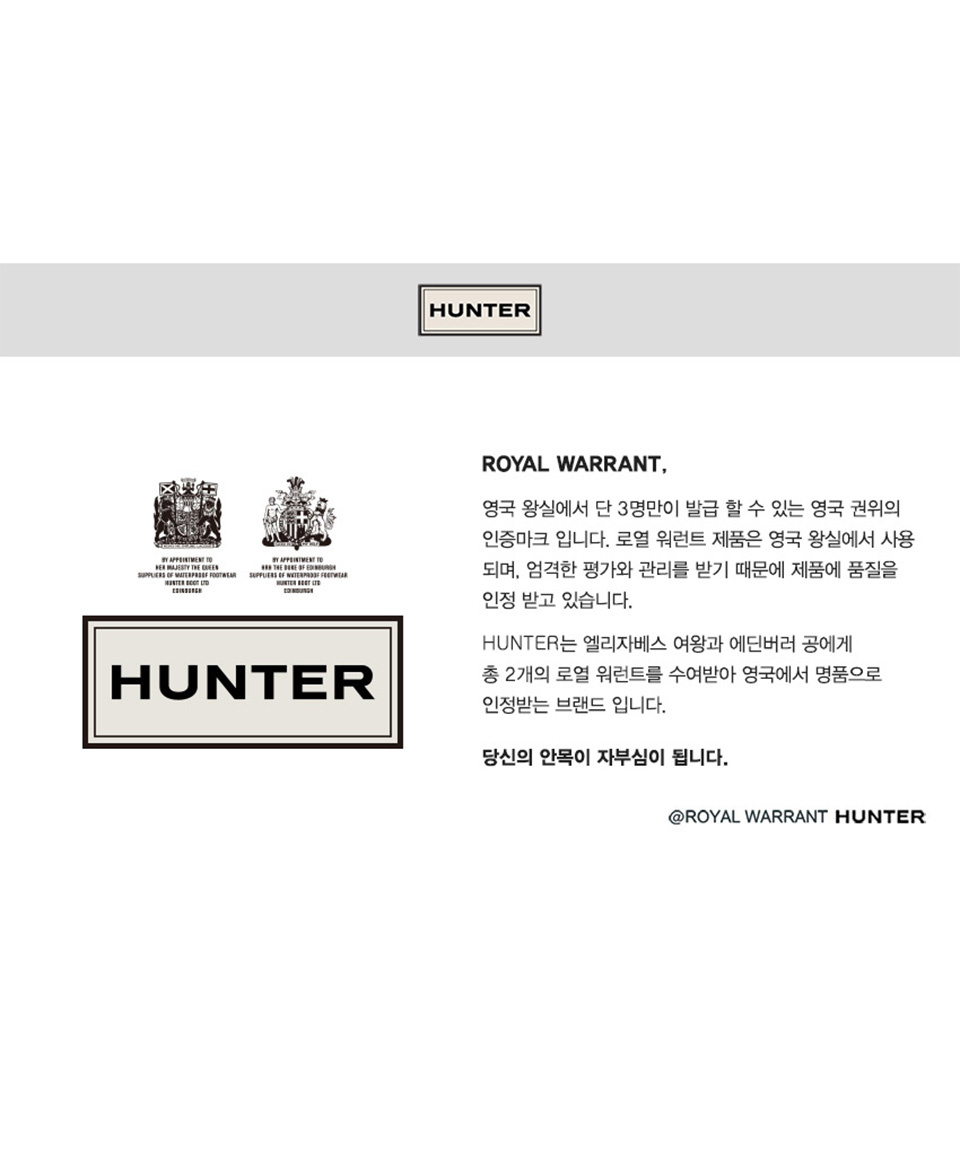 헌터(HUNTER)는 160년 전통의 브랜드로 1977년부터는 40년 넘게 영국 왕실에 제품을 공급하는 명품 브랜드입니다. 엘리자베스 여왕과 에딘버러 공에게 로열 워런트 2개를 수여 받으며 최고의 품질을 인정받고 품위 있는 디자인으로 꾸준한 사랑을 받고 있습니다.