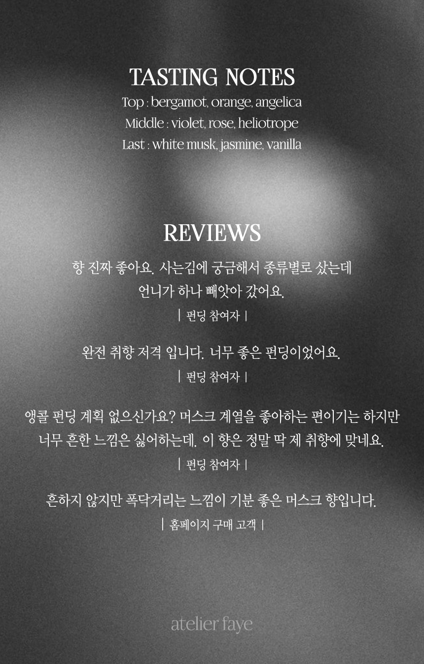 아뜰리에페이(ATELIERFAYE)는 뜻을 함께하는 조향사들이 모인 퍼퓸 하우스입니다. 자연의 풋풋하고 은은한 향기들, 마음에서 피어나는 감정들, 머릿속을 채우는 상상들은 물론, 다채로운 감성이 깃든 아트워크에서 영감을 받아 향기로운 아름다움을 창조하며 그 안에 환상을 담습니다.