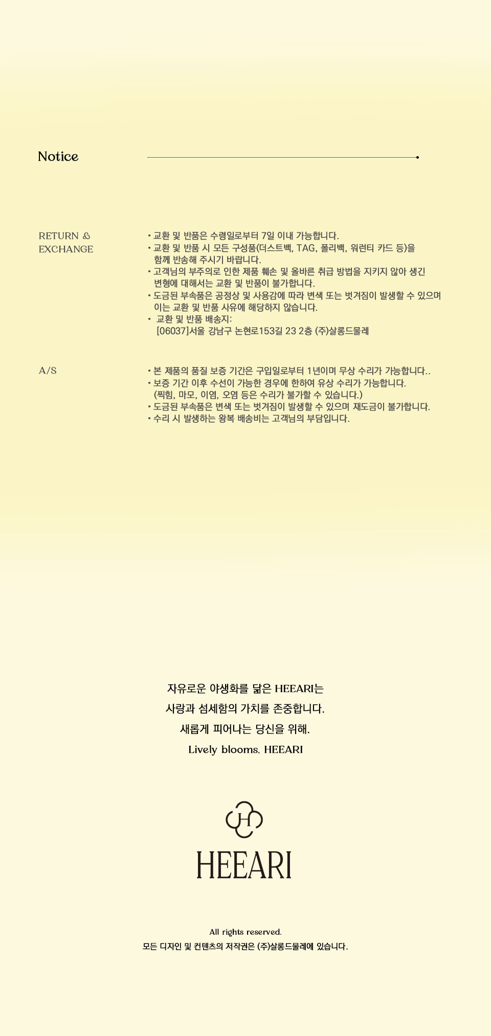 히어리(HEEARI)는 자유로운 야생화를 닮았으며, 새롭게 피어나는 당신을 위해 사랑과 섬세함의 가치를 존중합니다.
