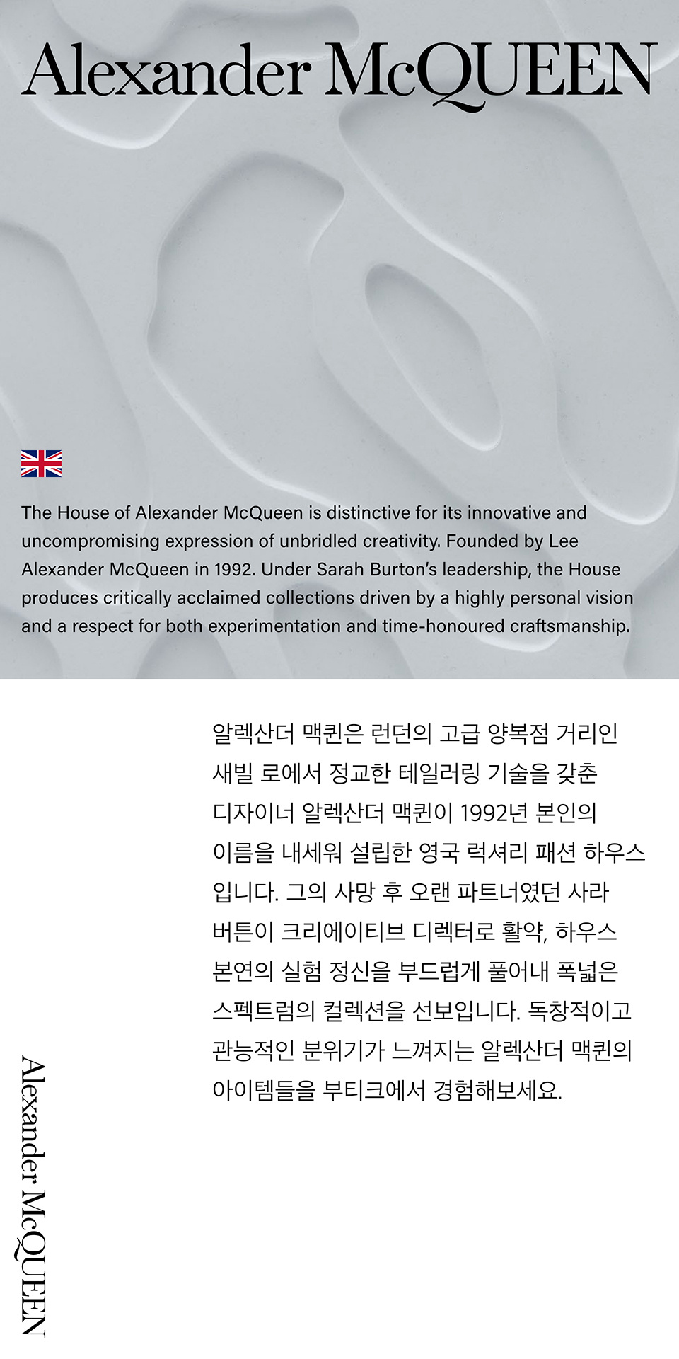 ALEXANDER McQUEEN(알렉산더 맥퀸)은 소재에 대한 무조건적인 사랑과 세부적인 관심에 영감을 받은 기성복 브랜드입니다.