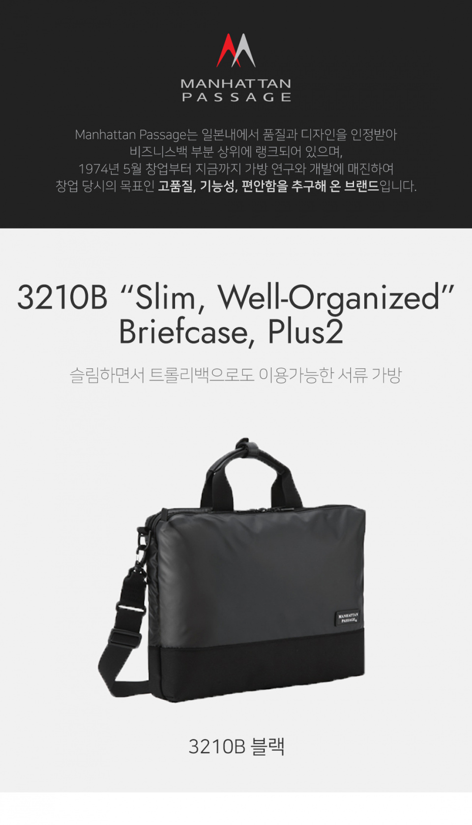 MANHATTANPASSAGE(맨하탄페세지)는 일본 내 품질과 디자인을 인정받아 비즈니스 백 판매 부분 상위에 랭크되어있는 40년 전통의 브랜드입니다.