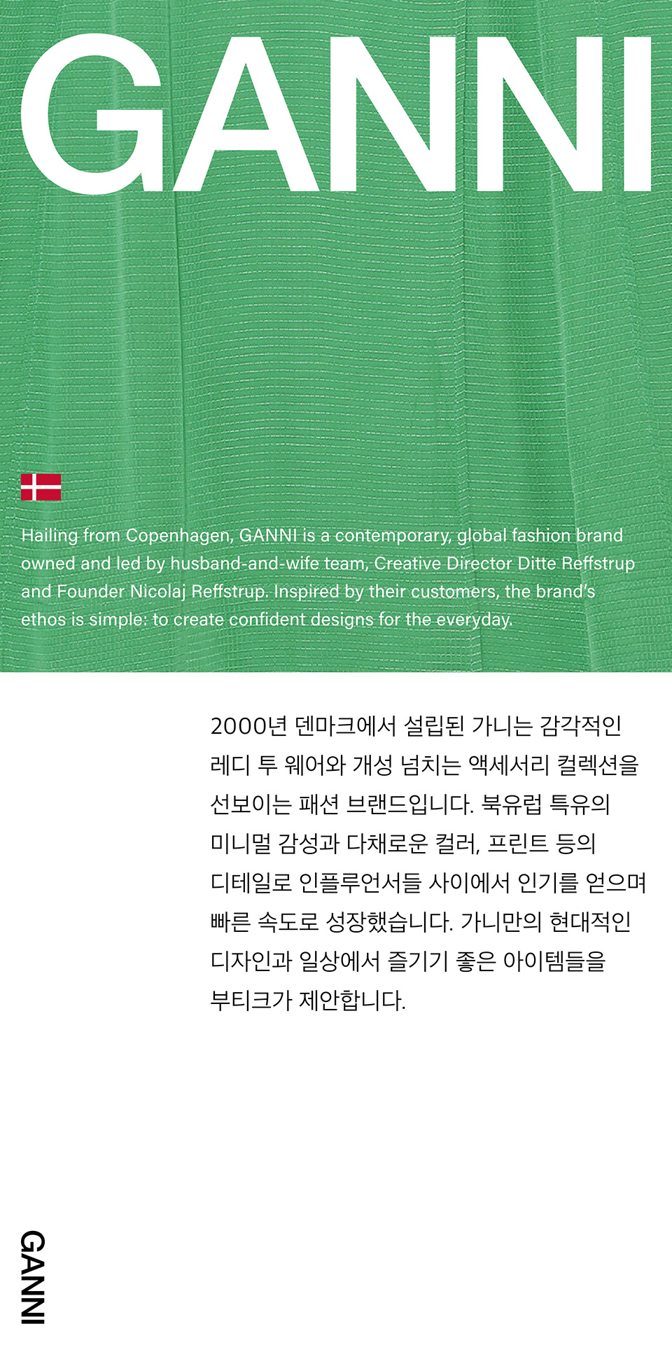 가니(GANNI)는 코펜하겐에서 탄생한 브랜드로 코펜하겐의 다채로운 색감이 브랜드에 고스란히 녹아있습니다. 또한 플로럴 패턴, 스마일 로고, 애니멀 프린팅, 레인보우 컬러를 통해 가니 특유의 유쾌한 디자인을 전개하고 있습니다.