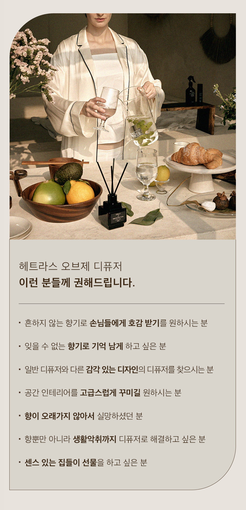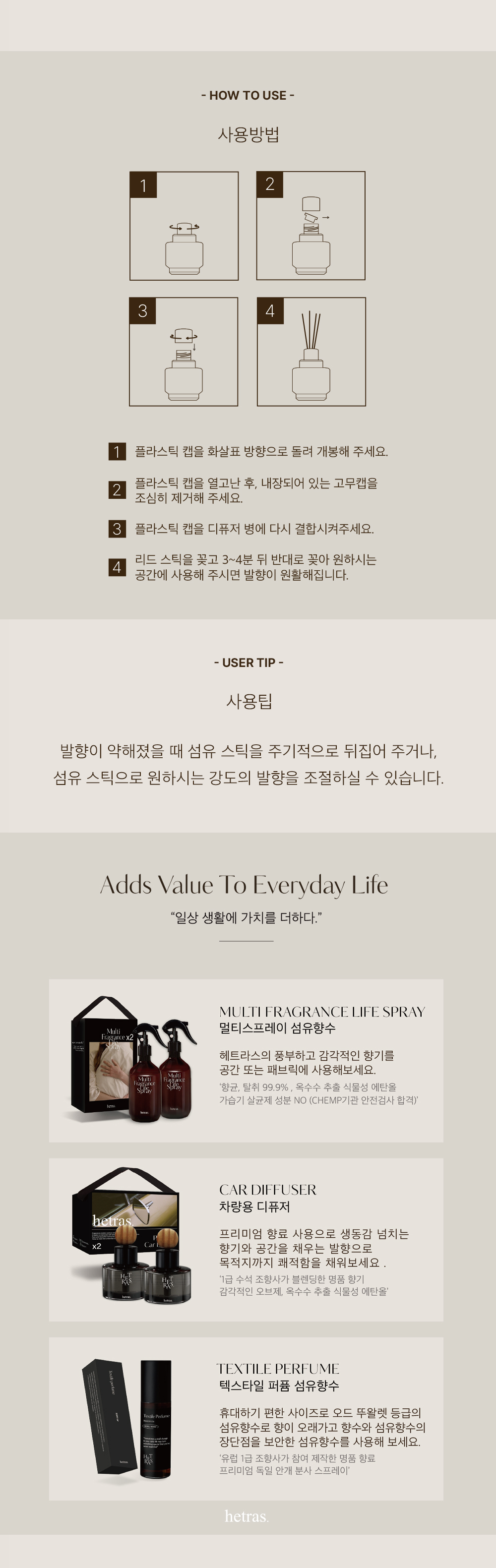 헤트라스 뷰티(HETRAS BEAUTY) 는 하루하루 지쳐가는 삶 속 향으로 행복을 기억하고 삶의 치유를 전달하고자 하는 브랜드입니다.