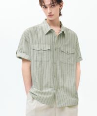 섬머 스트라이프 오버핏 롤 업 반팔 셔츠 [라이트 카키]