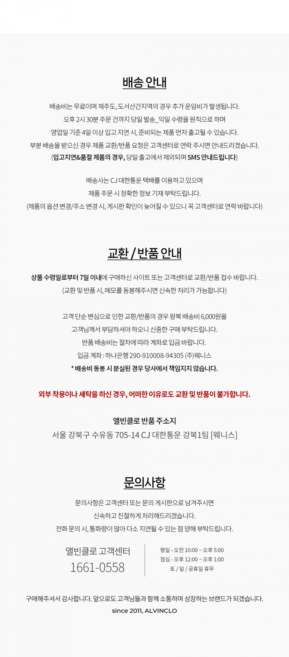 앨빈클로(ALVINCLO)는 '옷을 입는 한 사람'으로서 언제 어디서나 편안하고 트렌디한 옷을 만들기 위해 끊임없이 노력하고 성장하고자 합니다. 다양하게 변화하는 디자인 흐름 속에서 본질에 충실하면서도 유니크한 디자인을 선보입니다. 또한, 론칭 이후 지금까지 국내 원단 사용&생산을 고집하고 있으며 철저한 품질 관리를 통해 눈치채기 힘든 부분까지 디테일하게 관리합니다.