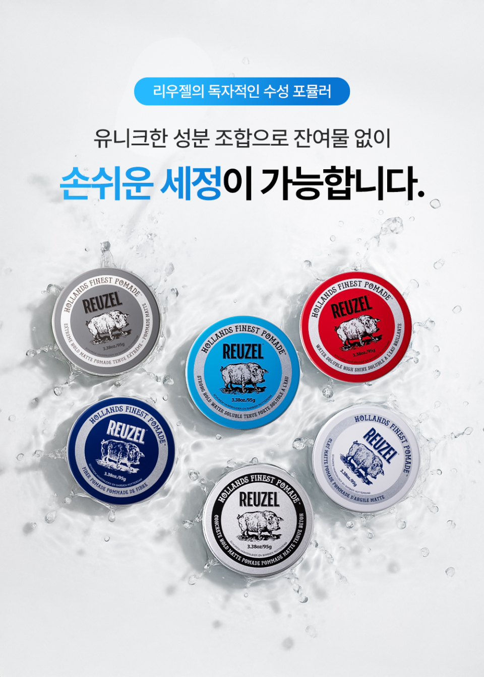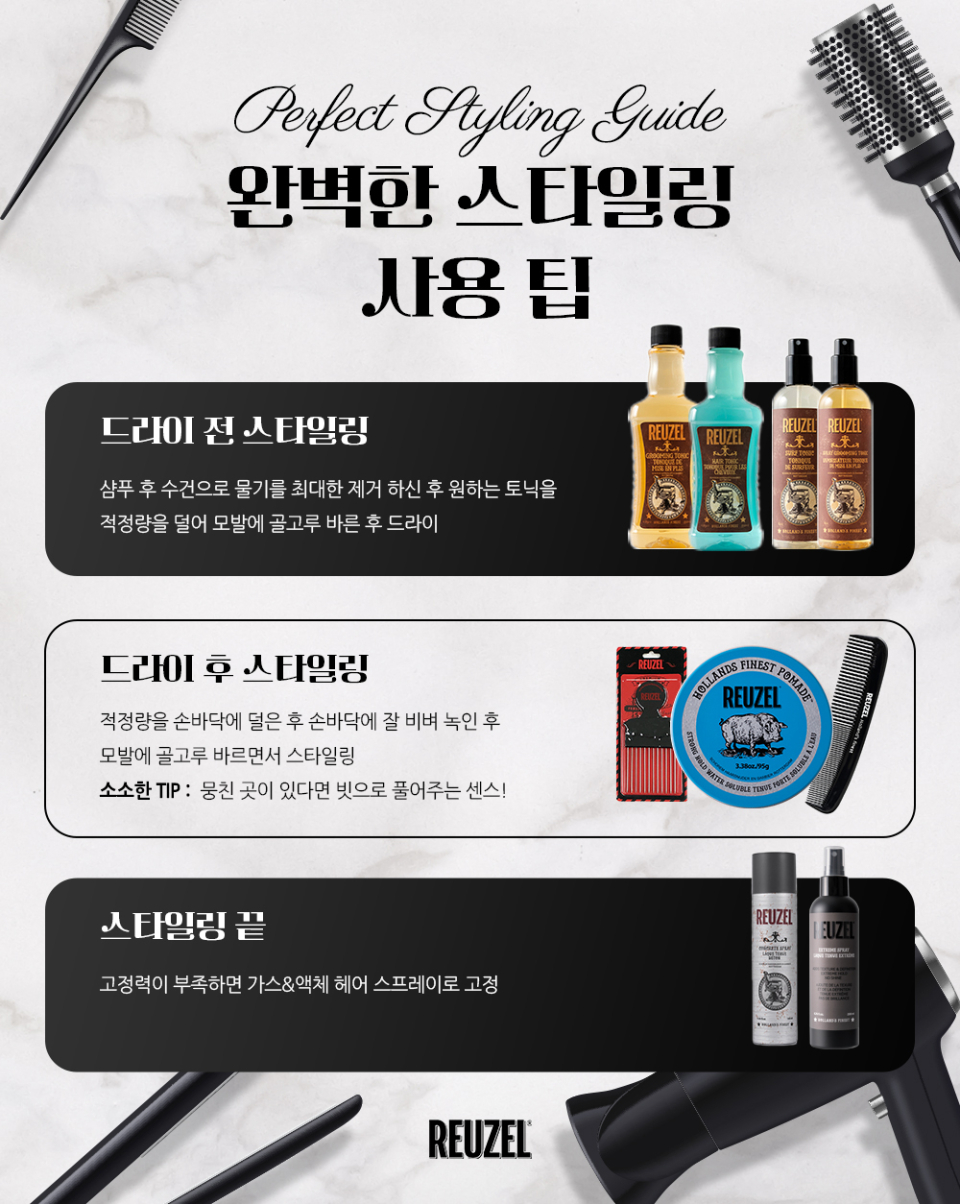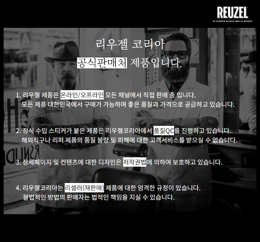 리우젤(REUZEL)은 네덜란드의 바버숍 스호름(SCHOREM)의 독창적인 아이디어로 개발된 포마드를 시작으로, 현재 전 세계 75개국의 남성이 사용하고 있는 남성 토털 헤어스타일 전문 브랜드로 발전하였습니다.