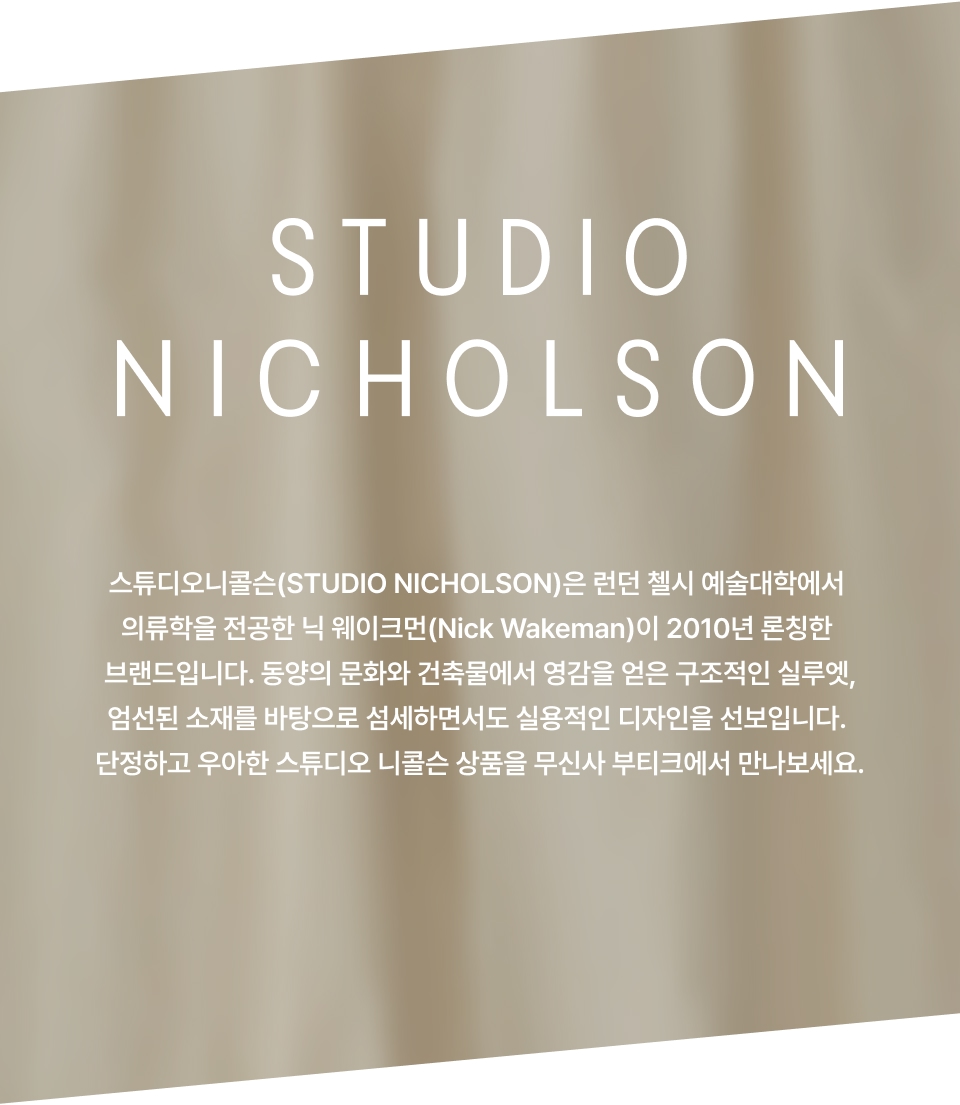 스튜디오 니콜슨(STUDIO NICHOLSON)은 런던의 첼시 예술대학에서 의류학을 전공한 닉 웨이크먼(Nick Wakeman)이 2010년 론칭한 브랜드입니다. 동양의 문화와 건축물, 인테리어에서 영감을 얻은 구조적인 실루엣과 엄선된 우수한 원단과 소재를 바탕으로 섬세하면서도 일상생활에 꼭 필요한 실용적인 디자인을 선보입니다.