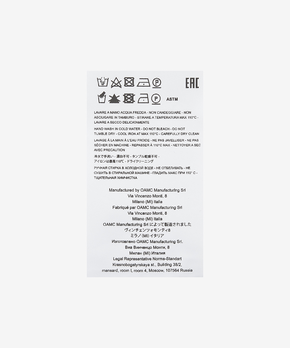 오에이엠씨(OAMC)는 2013년 칼하트 WIP와 슈프림 출신의 디자이너 듀오가 설립한 브랜드입니다. Over All Master Cloth의 약자인 OAMC는 자기표현이라는 주제 아래 만들어졌습니다. 음악, 미술, 영화, 사진 등 다양한 예술에서 영감을 받아 스트릿, 워크 웨어와 밀리터리 요소를 프리미엄 디자인에 녹여내 오래 입을 수 있는 질 좋은 제품을 제공합니다.