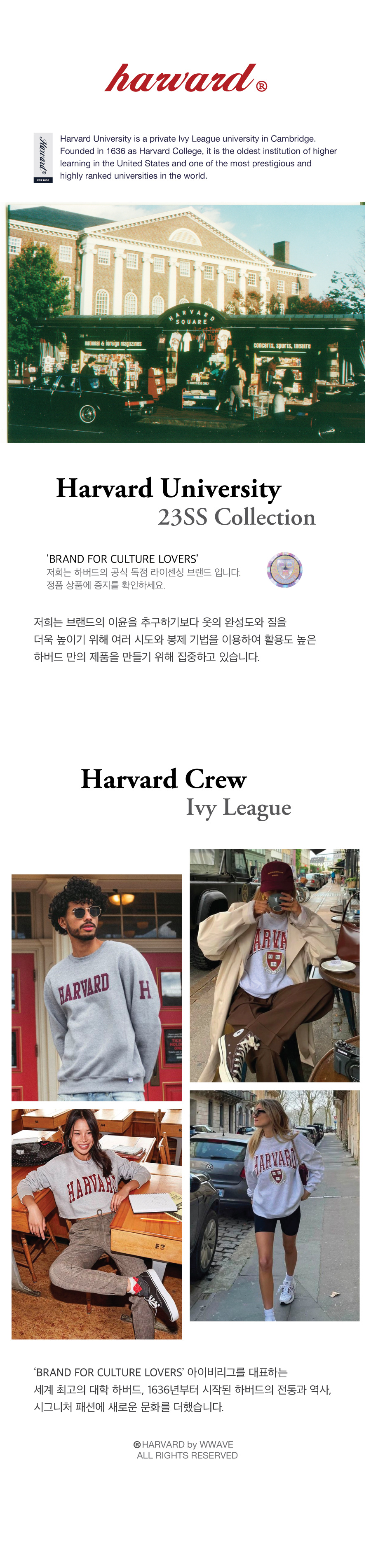 하버드(HARVARD)는 1636년 개교한, 오랜 역사와 전통을 자랑하는 미국 사립 종합대학교(University of the United States)입니다. 미국 동부의 명문 대학교 학생들이 선호하는 아이비리그 스타일을 기본으로 하며, 캐주얼하고 현대적인 요소가 강하게 드러납니다. 또한, 하버드 로고는 명문 대학의 한정적인 이미지를 초월하여 하나의 문화이자 명예와 존경을 상징하는 아이콘으로 자리 잡았습니다.