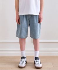 린넨 라이크 원 턱 와이드 밴딩 데님 쇼츠 [라이트 인디고]