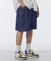 버뮤다 와이드 원턱 워시드 데님 쇼츠 딥인디고