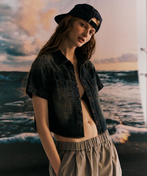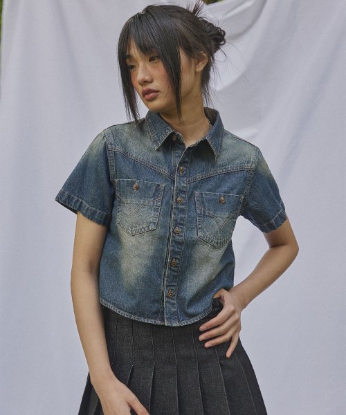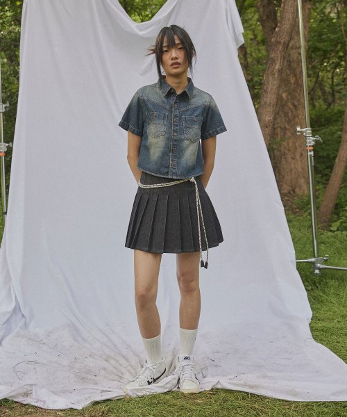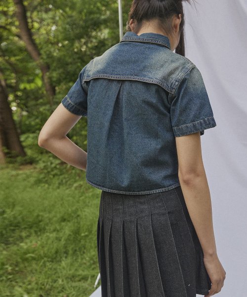 페머랄드 2801 더스티워시 미디움인디고 크롭 반팔셔츠