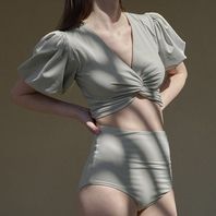 퍼프슬리브와 꼬임디테일로 유니크한 스윔 브라탑입니다.