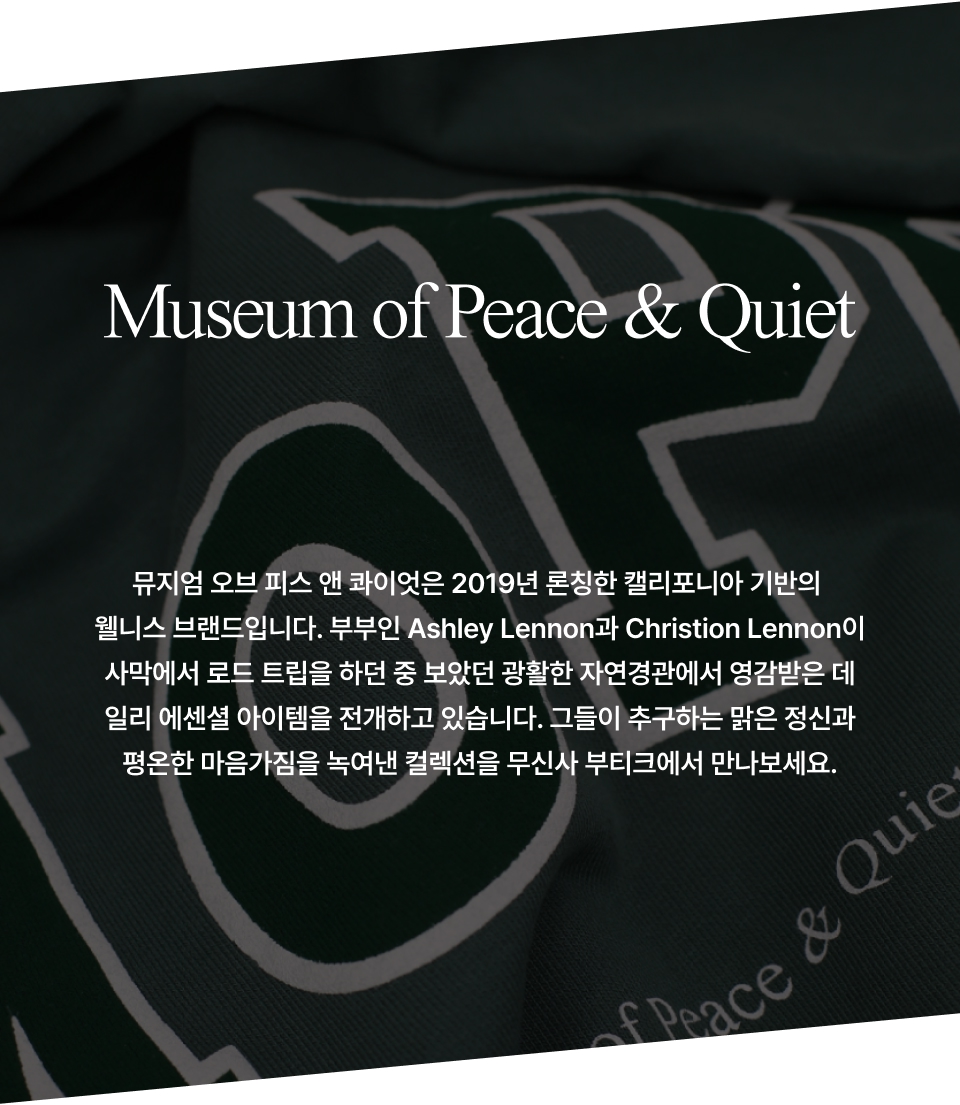 뮤지엄 오브 피스 앤 콰이엇(MUSEUM OF PEACE&QUIET)은 2019년 론칭한 캘리포니아 기반의 웰니스 브랜드입니다. 부부인 Ashley Lennon과 Christion Lennon이 사막에서 로드 트립을 하던 중 보았던 광활한 자연경관에서 영감을 받아, 이를 바탕으로 한 군더더기 없는 에센셜 아이템을 디자인합니다. 현대인의 복잡한 일상에서도 그들이 추구하는 맑은 정신과 평온한 마음가짐을 녹여낸 컬렉션을 선보입니다.
