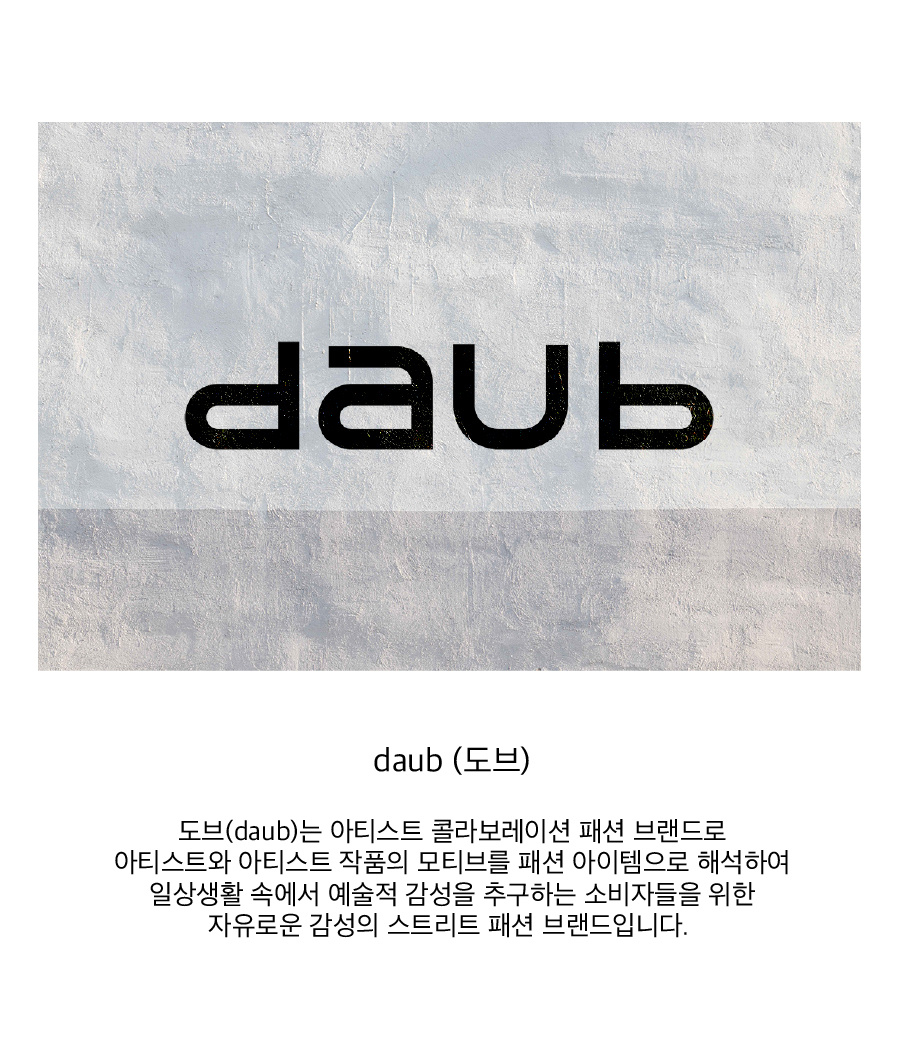돕(DAUB)는 아티스트 컬래버레이션 패션 브랜드로 아티스트와 아티스트 작품의 모티브를 패션 아이템으로 해석하여 일상생활에서 예술적 감성을 추구하는 소비자를 위한 자유로운 감성의 스트릿 패션 브랜드입니다.