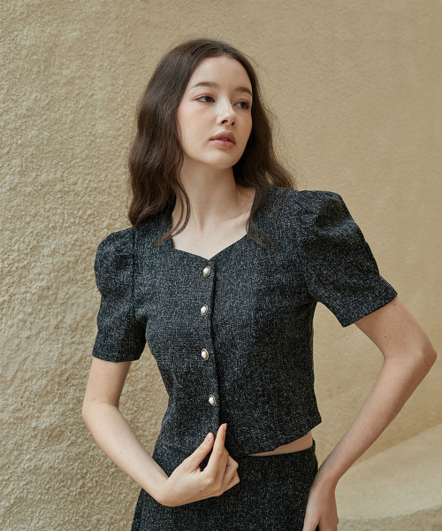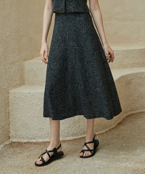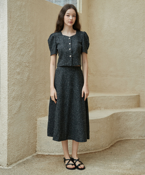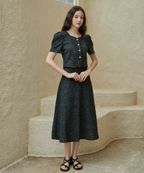 [SET] 하트넥 트위드 블라우스 + 트위드 에이라인 롱 스커트 블랙