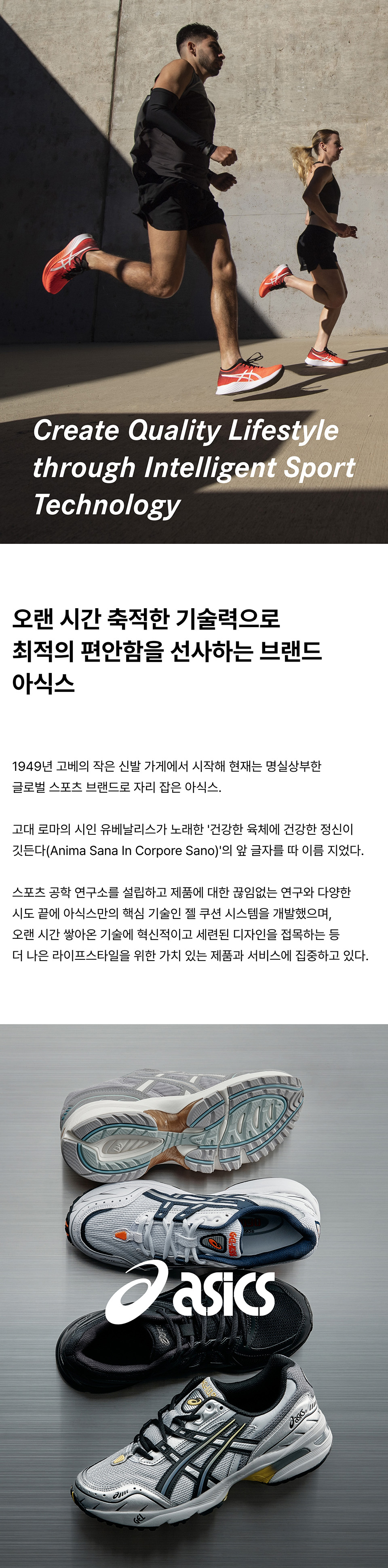 ASICS(아식스)는 1949년 "스포츠를 통해서 아이들의 건전한 육성에 보탬이 되겠다."라는 이념으로 설립되었습니다. ASICS (아식스) 브랜드명은 라틴어 “건강한 정신은 건강한 육체에서(Anima Sana In Corpore Sano)”의 알파벳 앞 글자에서 가져왔으며, 전 세계적으로 사랑받고 있는 글로벌 스포츠 브랜드입니다.