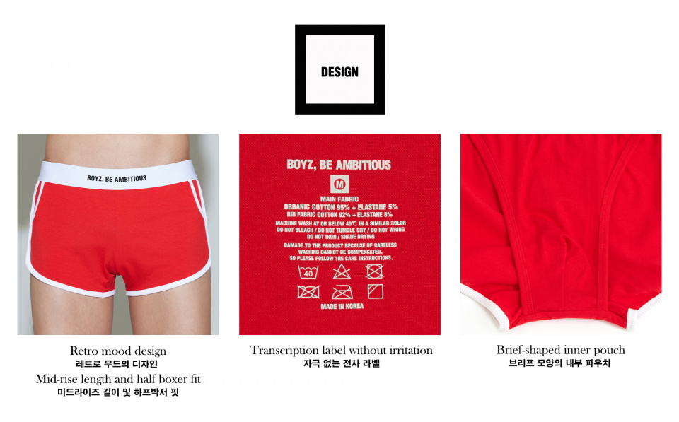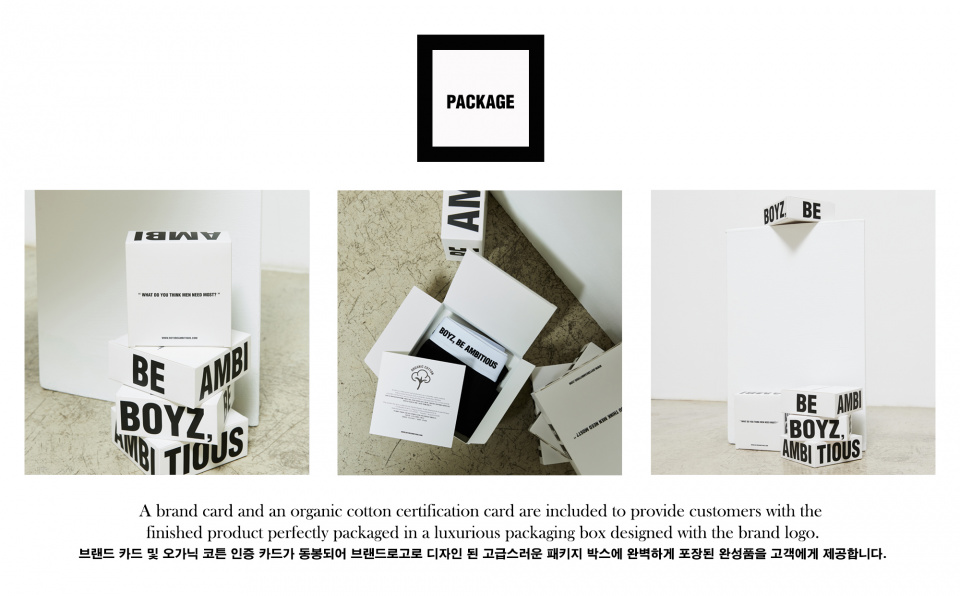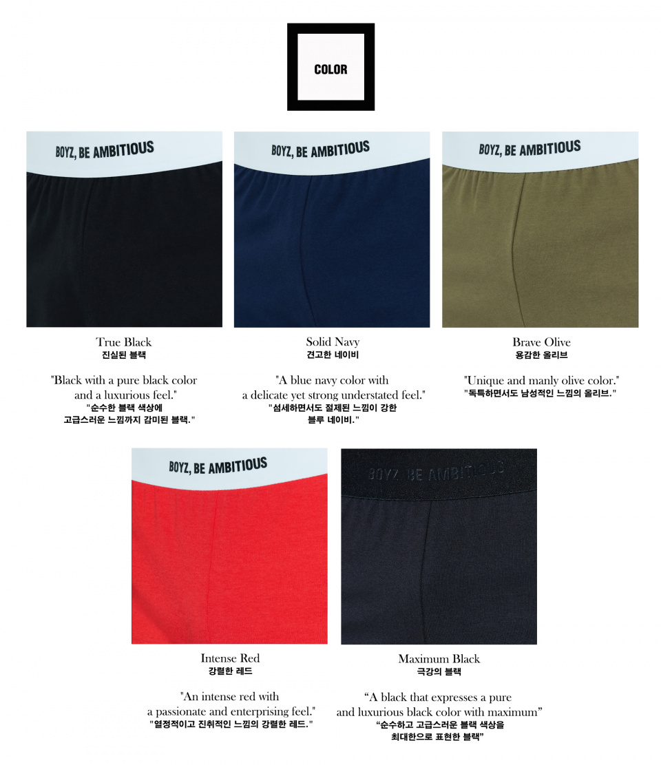 보이즈비앰비셔스(BOYZ BE AMBITIOUS)는 모든 남성에게 가장 필요한 것이 무엇인지 생각하였고, 일반적으로 우리 몸에 가장 먼저 닿는 필수 아이템을 디자인했습니다.