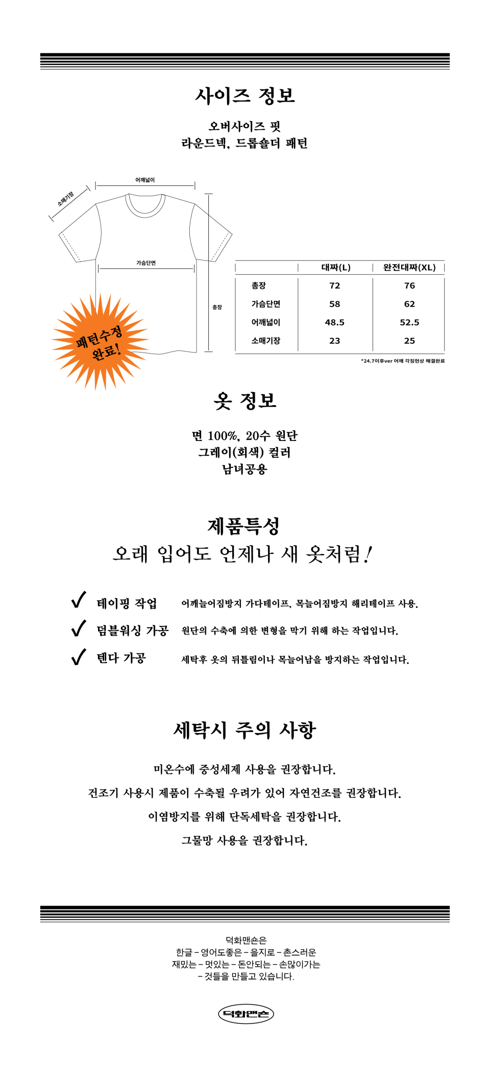 덕화맨숀(DUCKHWA MANSION)은 한글로 된 옷을 입는 것이 이상하거나 촌스럽지 않길 바랍니다. 멋있고 재미있지만 손이 많이 가며 돈이 되지 않는 그런 것들을 만듭니다.