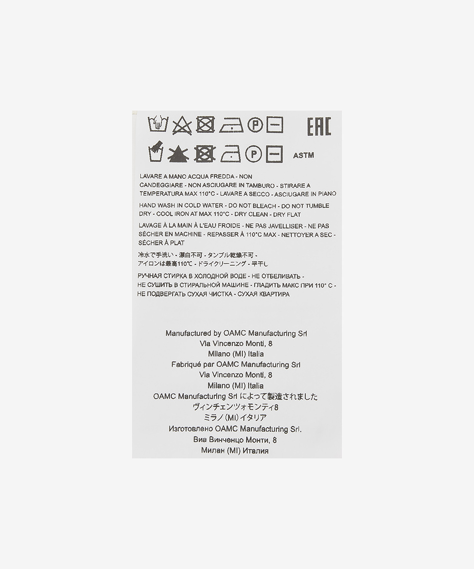 오에이엠씨(OAMC)는 2013년 칼하트 WIP와 슈프림 출신의 디자이너 듀오가 설립한 브랜드입니다. Over All Master Cloth의 약자인 OAMC는 자기표현이라는 주제 아래 만들어졌습니다. 음악, 미술, 영화, 사진 등 다양한 예술에서 영감을 받아 스트릿, 워크 웨어와 밀리터리 요소를 프리미엄 디자인에 녹여내 오래 입을 수 있는 질 좋은 제품을 제공합니다.