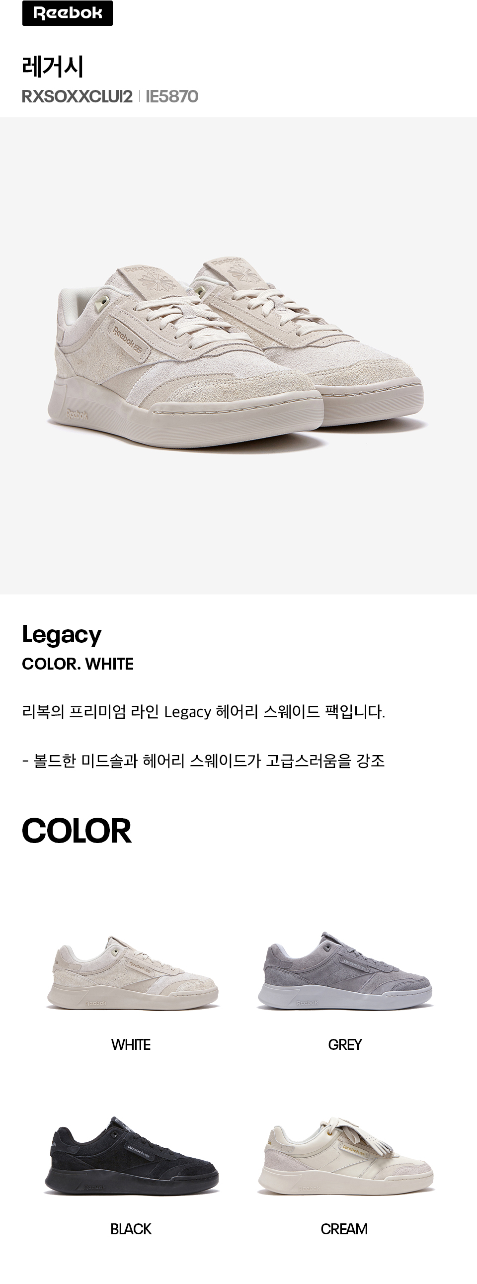 리복(REEBOK)은 1895년 세계 최초의 스파이크 러닝화 개발을 시작으로 뛰어난 기술력과 트렌디한 디자인을 집약한 혁신적인 아이템을 선보이는 브랜드입니다. 클럽 C 85, 클래식 레더 등 리복 고유의 클래식 무드를 보여주는 스니커즈 라인은 컬처와 트렌드를 대변하는 아이콘이 되었고, 펌프, 헥사라이트, DMX 등 끊임없이 발전해 온 테크놀로지는 전 세계 스포츠인에게 꾸준히 사랑받고 있습니다. 또한, 활발하게 전개하는 컬래버레이션 라인과 혁신적인 시도를 통해 100여 년이 넘게 지난 지금도 무한한 가능성을 보여주고 있습니다.