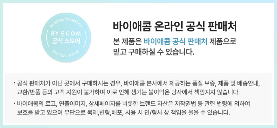 바이애콤(BYECOM)은 불필요한 유해 성분과 가격적 거품은 걷어내고 공신력 있는 국내 연구소에서 안전한 성분으로 만든 뛰어난 품질의 화장품을 소개합니다.