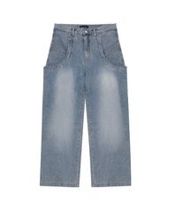 Washing curve pocket wide denim pants - LIGHT INDIGO