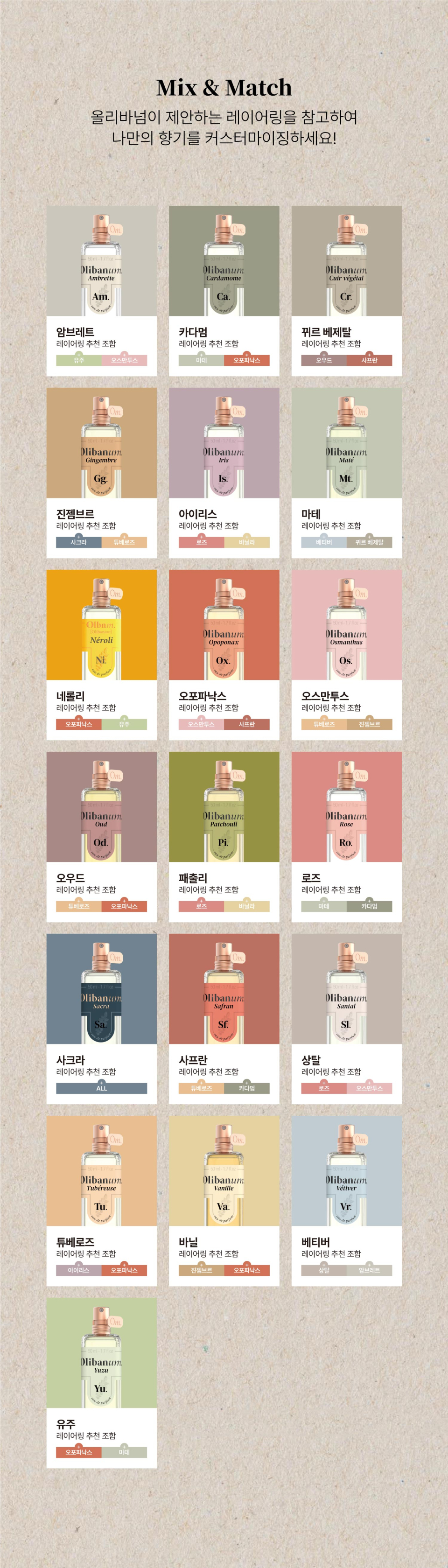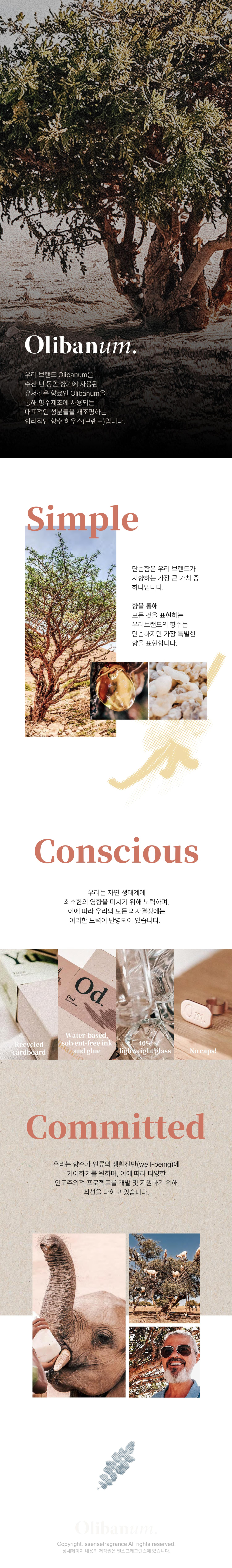 올리바넘(OLIBANUM)은 금보다 더 희귀한 향료 중 하나인 올리바넘 에센스에 상징적인 원료를 혼합하여 독창적인 향기를 표현합니다. 향료 그 자체에 초점을 두어 심플함과 동시에 완성도 높은 향기를 느낄 수 있으며, 취향에 따라 원하는 향기 레시피를 만들어 레이어링할 수도 있습니다.