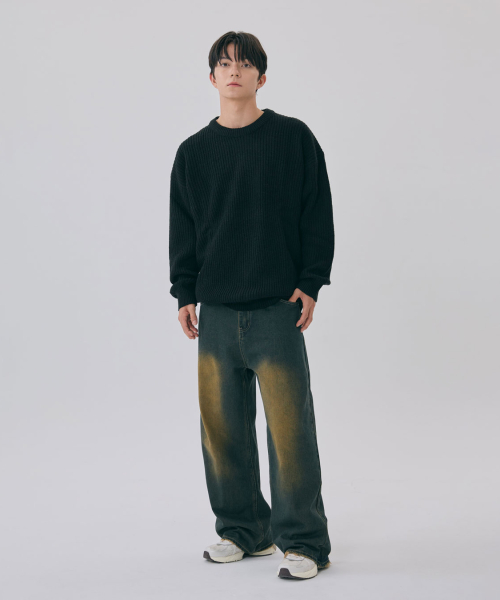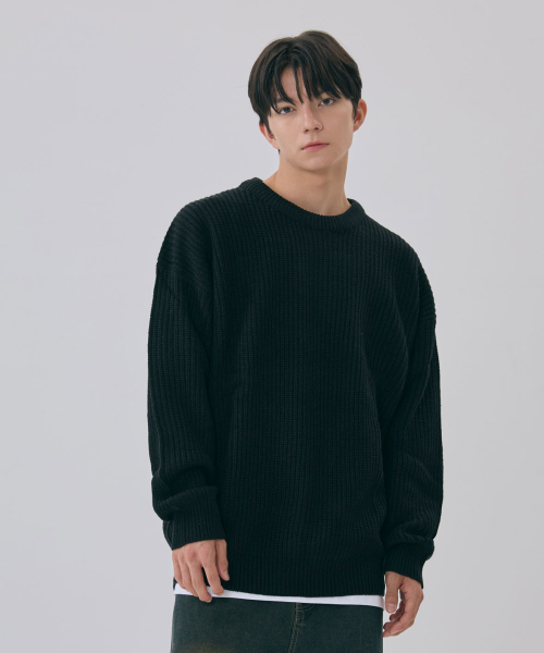 크루넥 오버핏 케이블 스웨터 니트 [블랙]