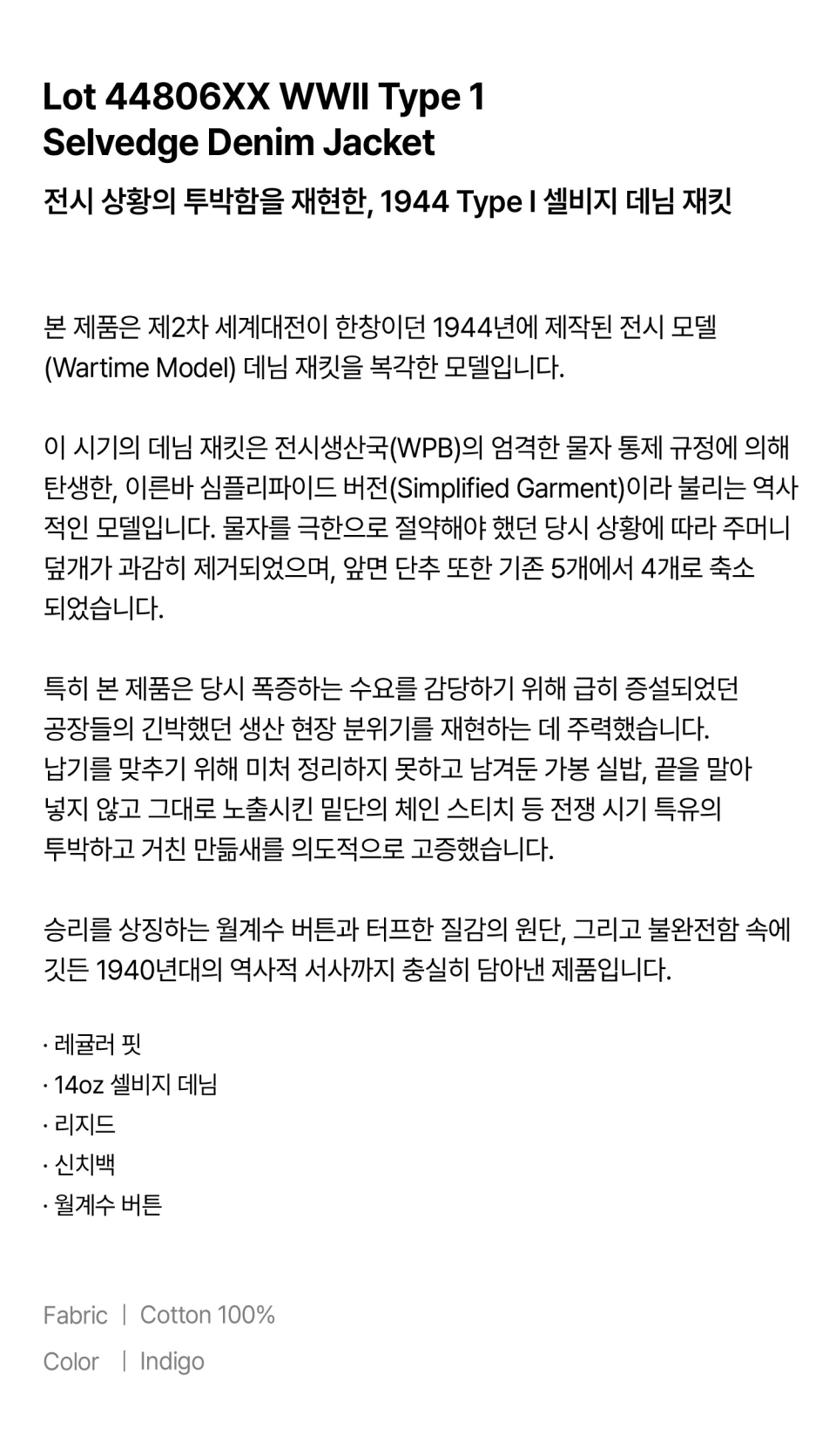 Lot 44801 1944 WWII Version Selvedge Denim Jeans