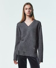 DAMAGE V NECK KNIT TOP [CHARCOAL]