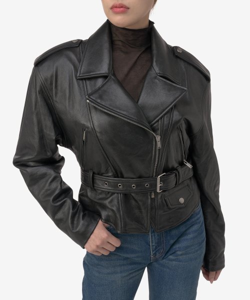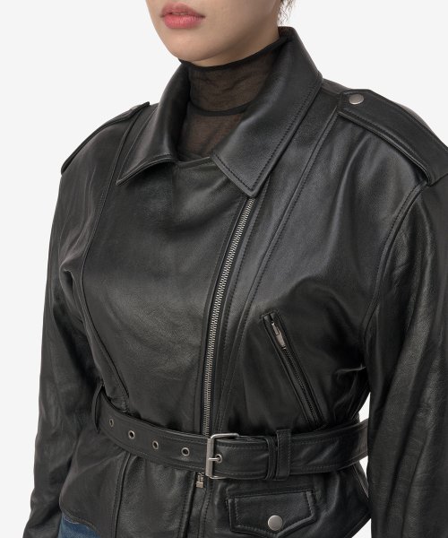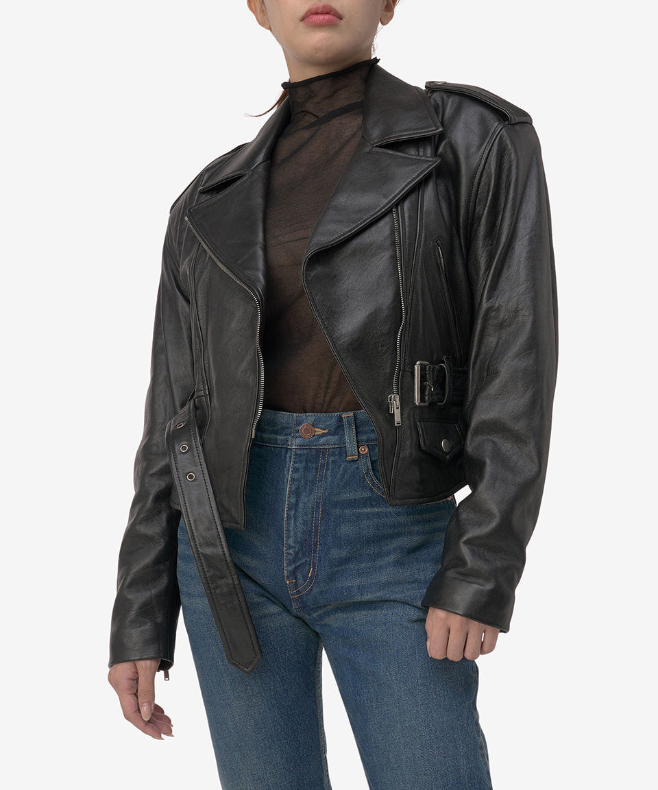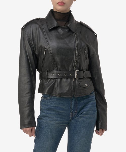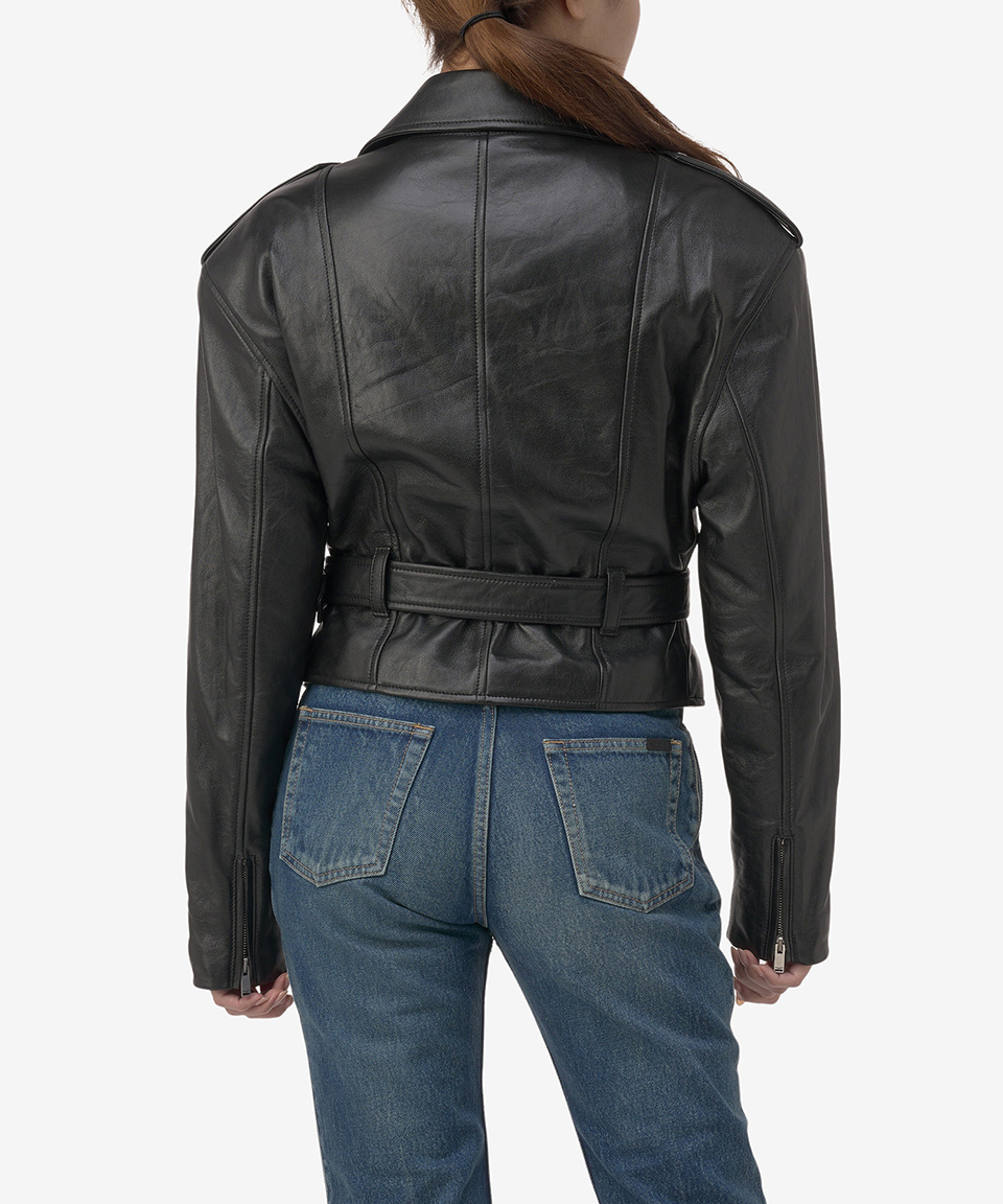 크롭 램스킨 바이커 재킷 - 블랙 / 735693YCNV21000
