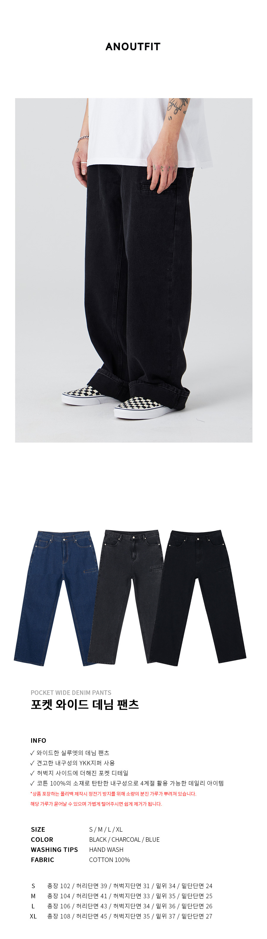 포켓 와이드 데님 팬츠 차콜