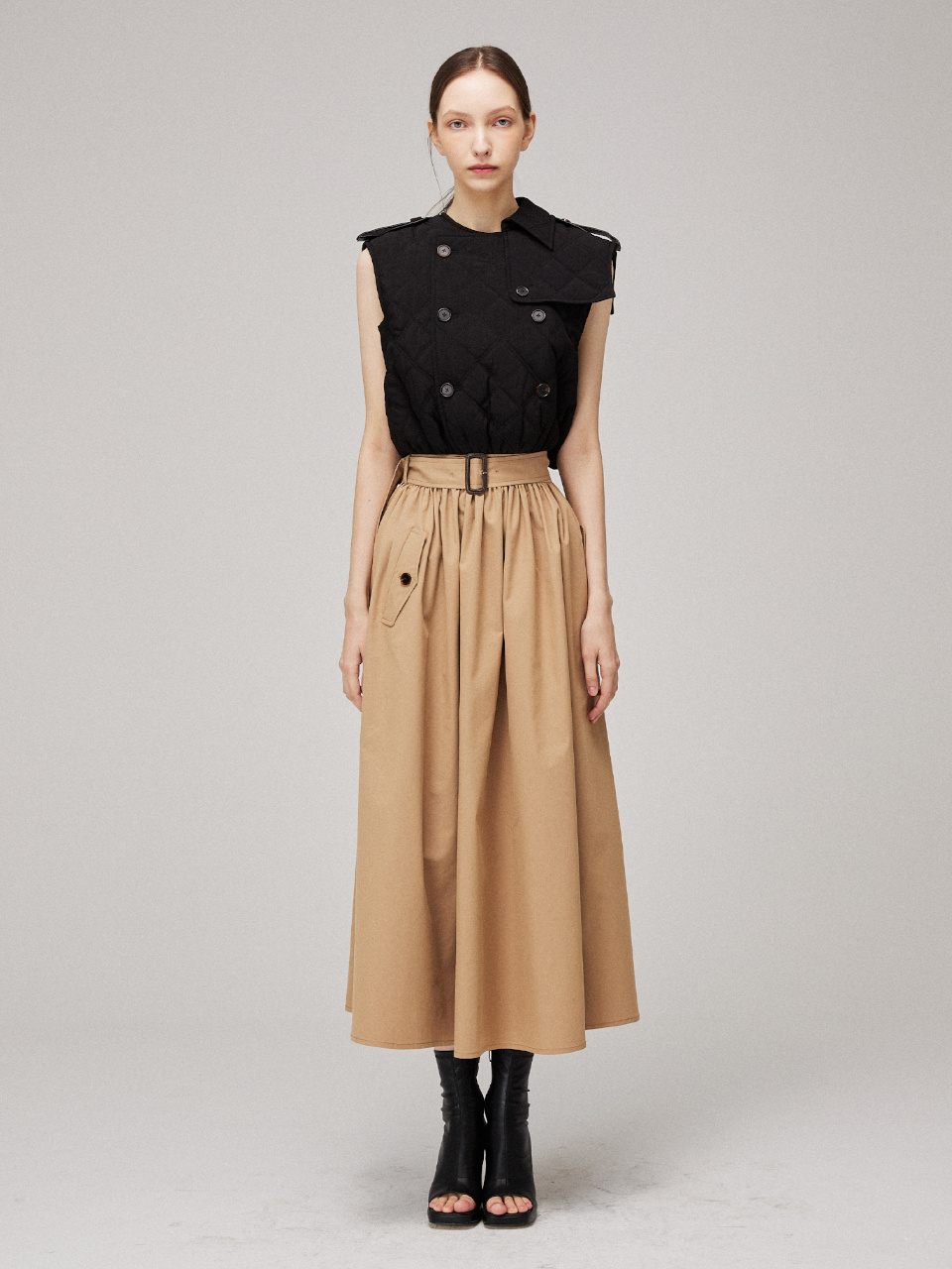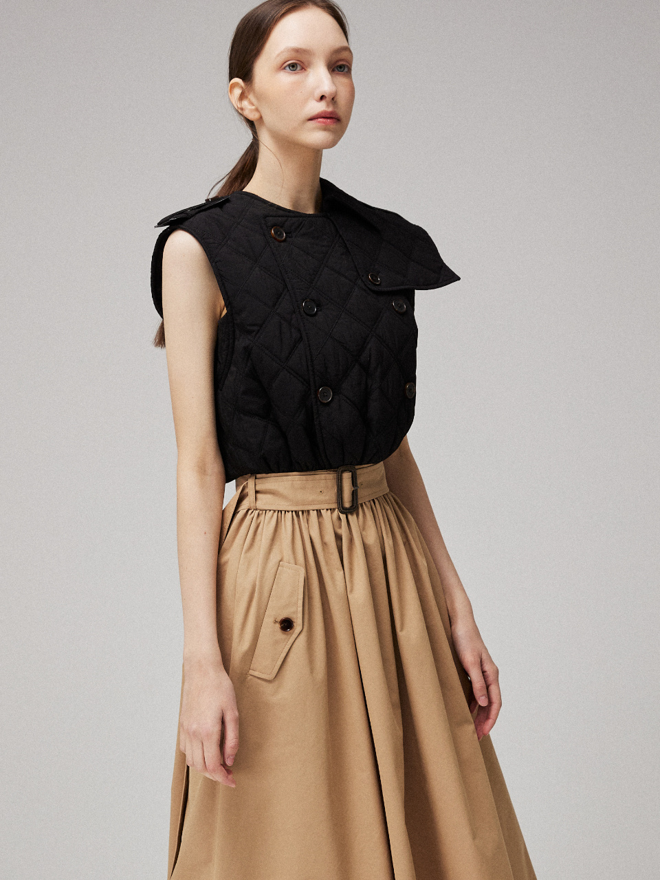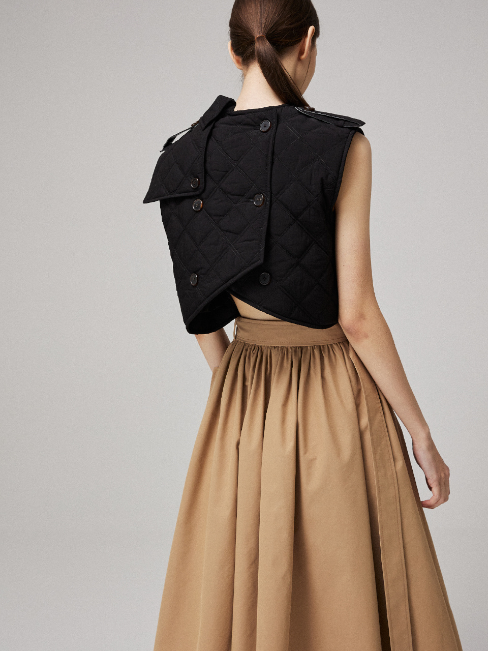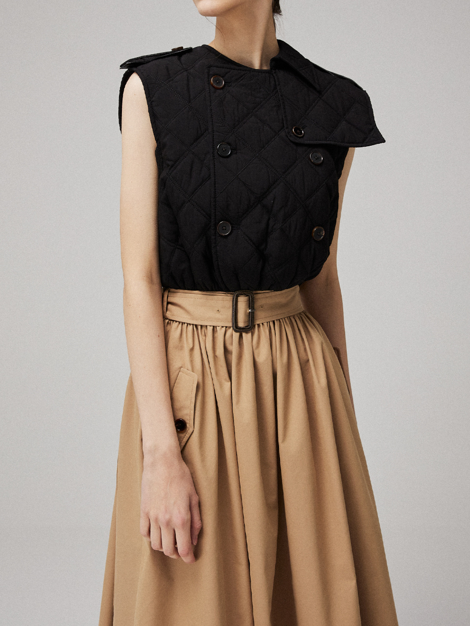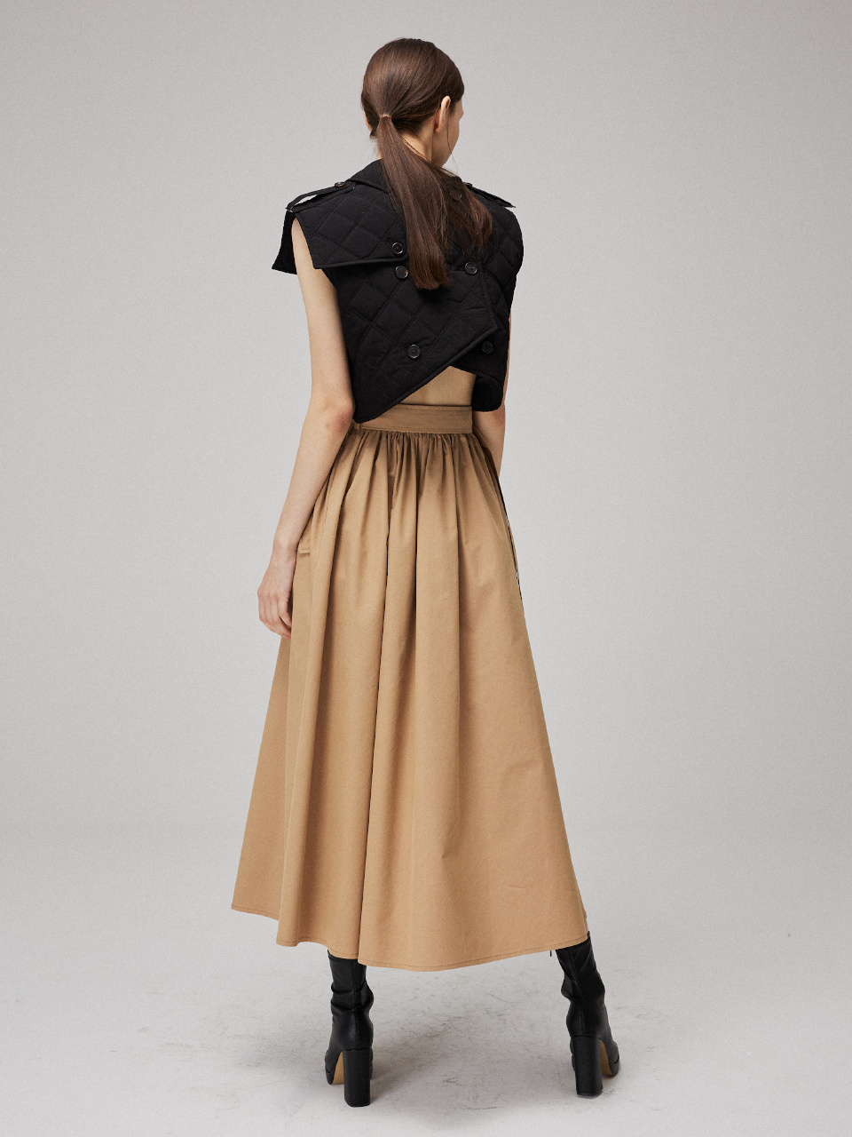 소프트한 텍스처의 퀼팅 패딩을 트렌치 드레스에 접목시켜 클래식하면서 유니크한 실루엣을 연출했습니다.