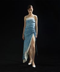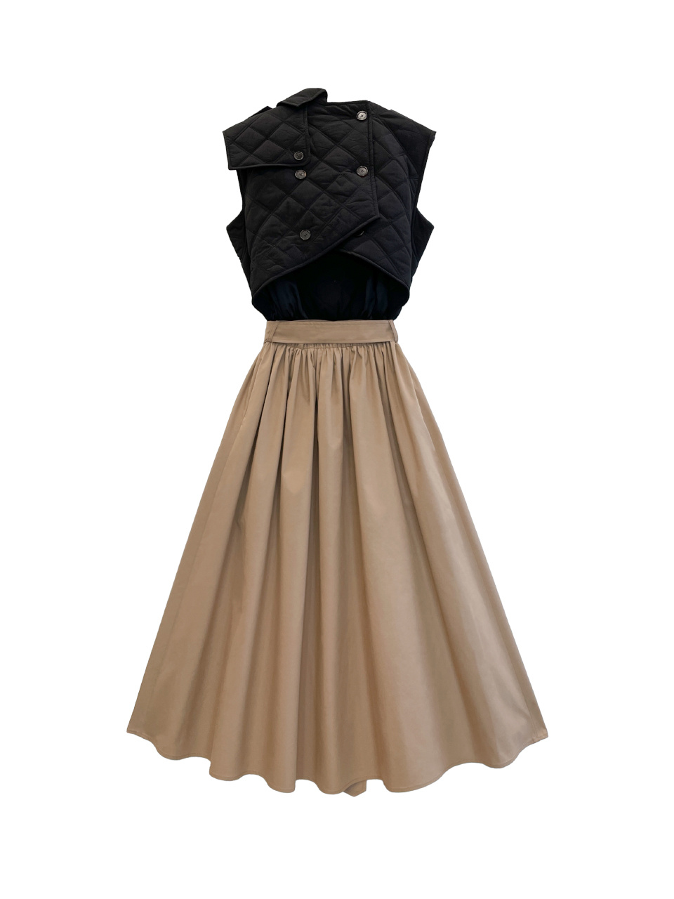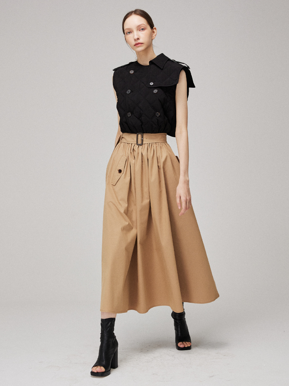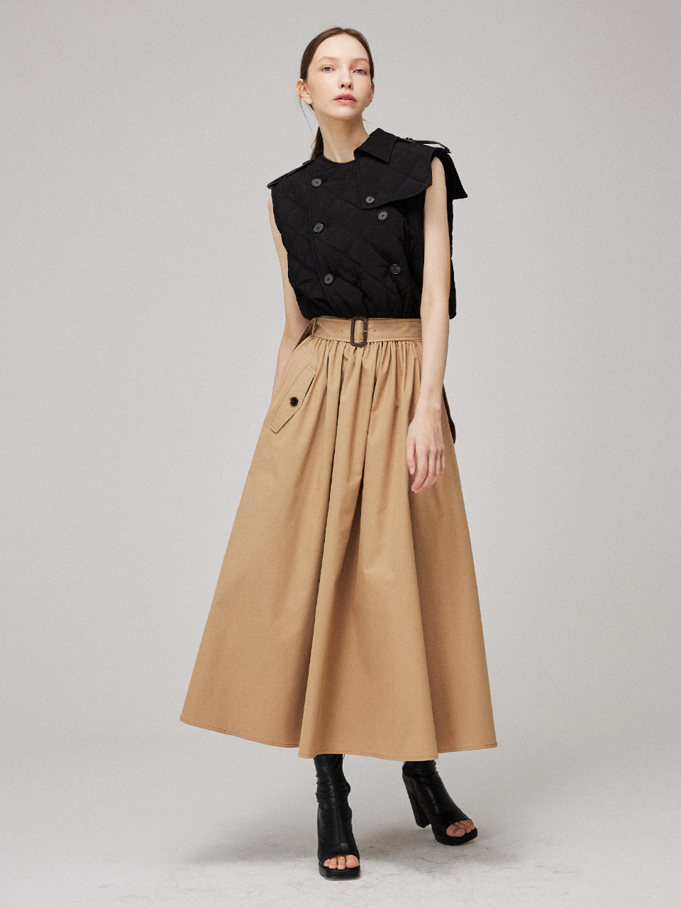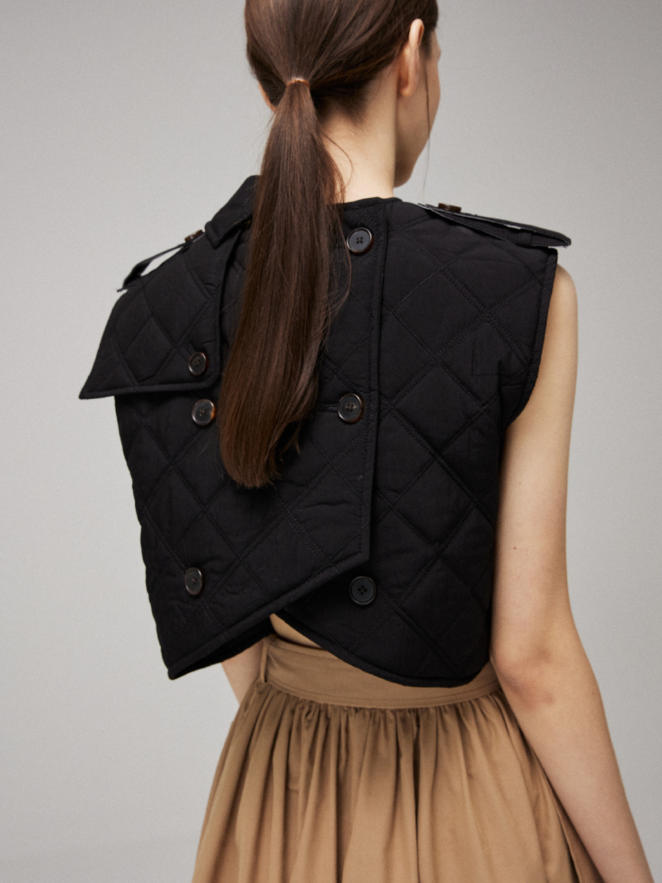 소프트한 텍스처의 퀼팅 패딩을 트렌치 드레스에 접목시켜 클래식하면서 유니크한 실루엣을 연출했습니다.