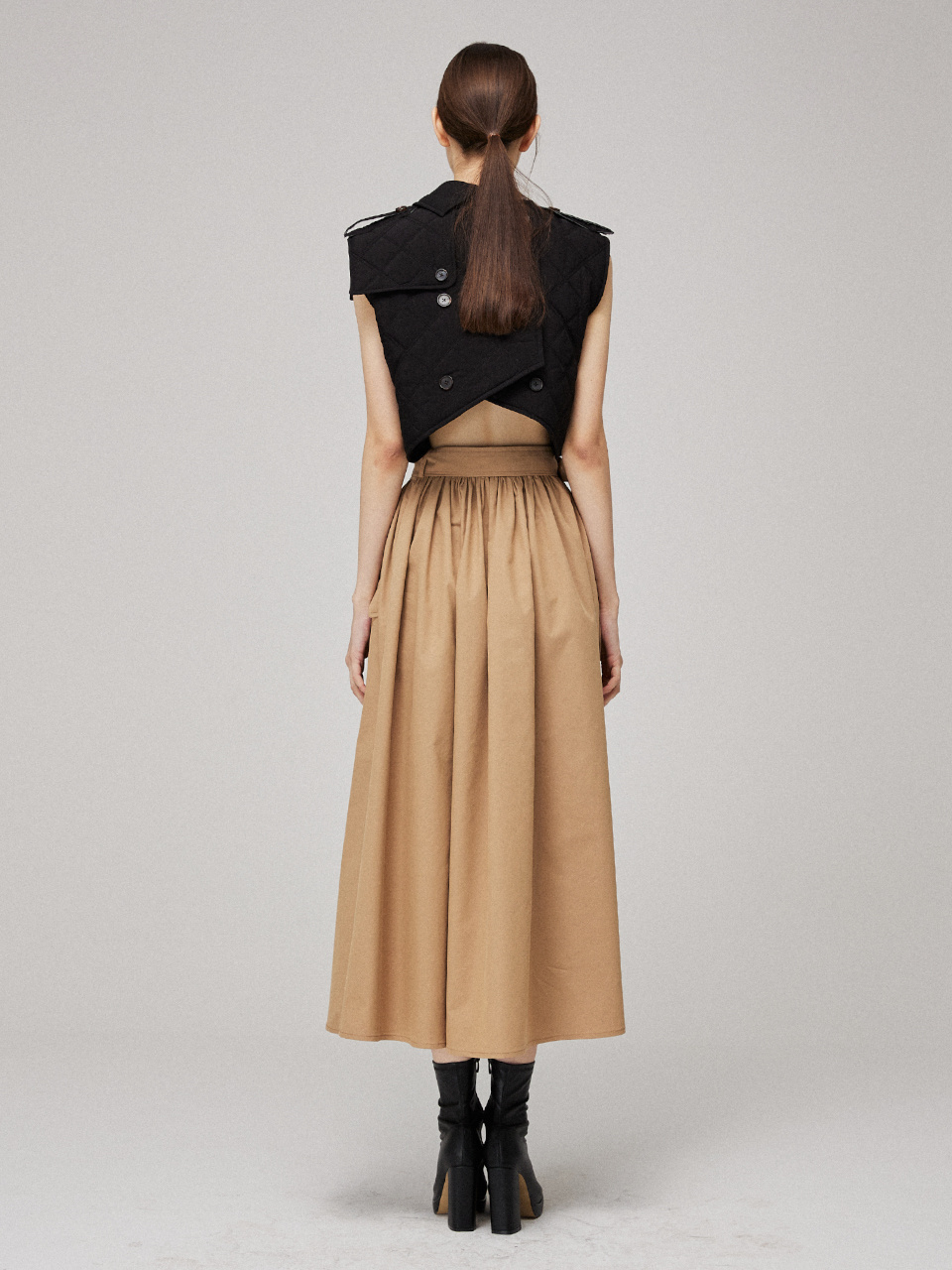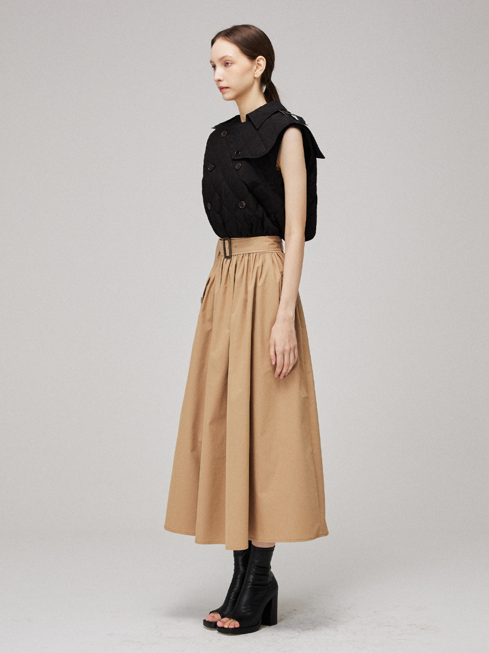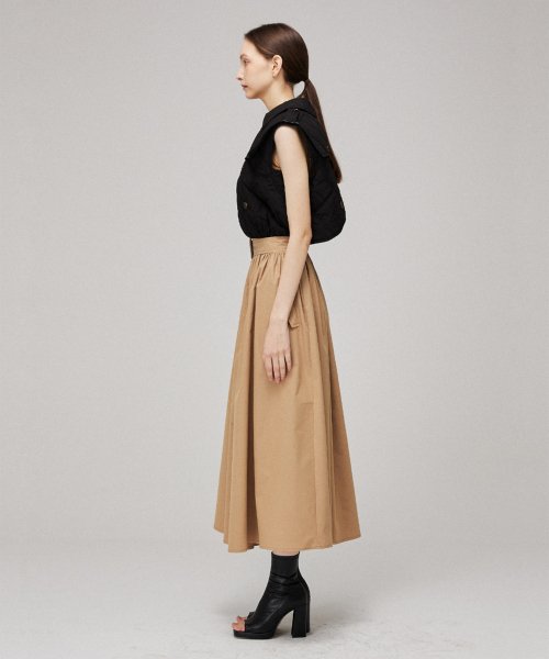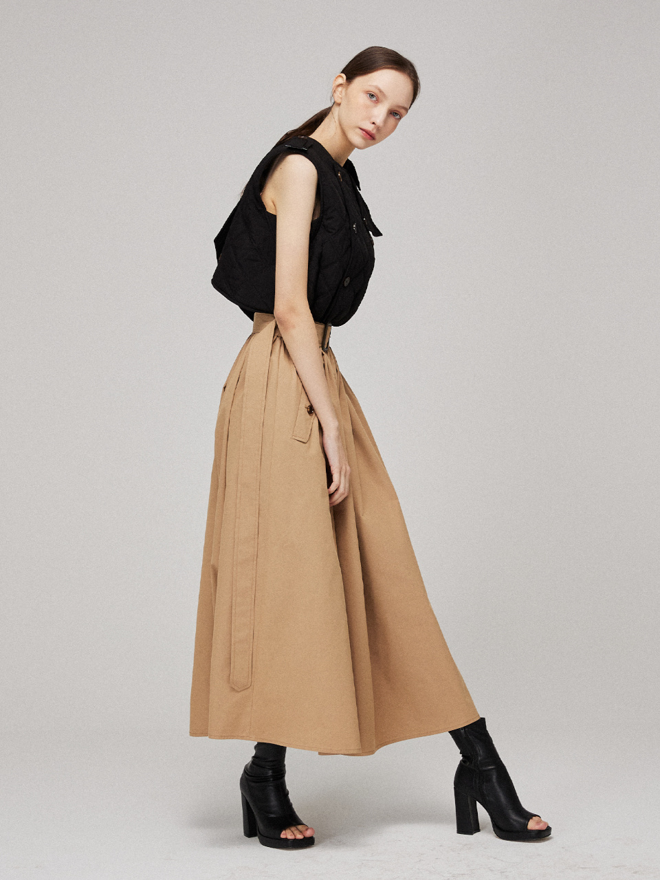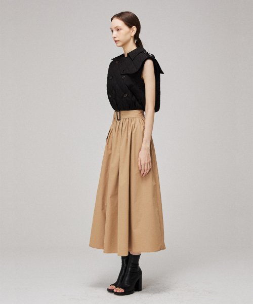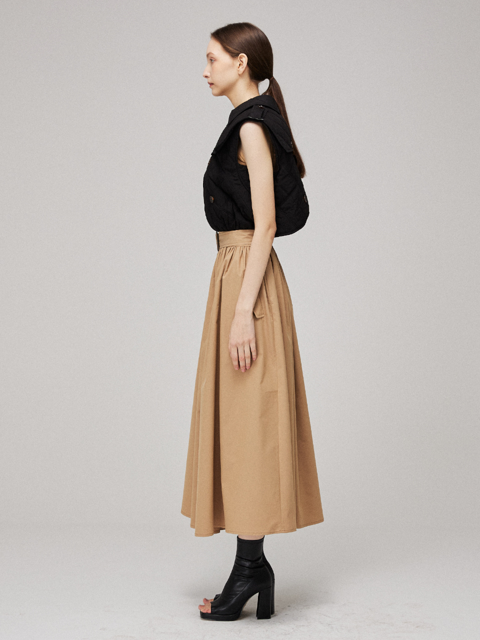 허리 부분은 뒷 밴딩으로 편안하게 착용가능하며, 스트랩으로 다양한 실루엣을 연출하실 수 있습니다.