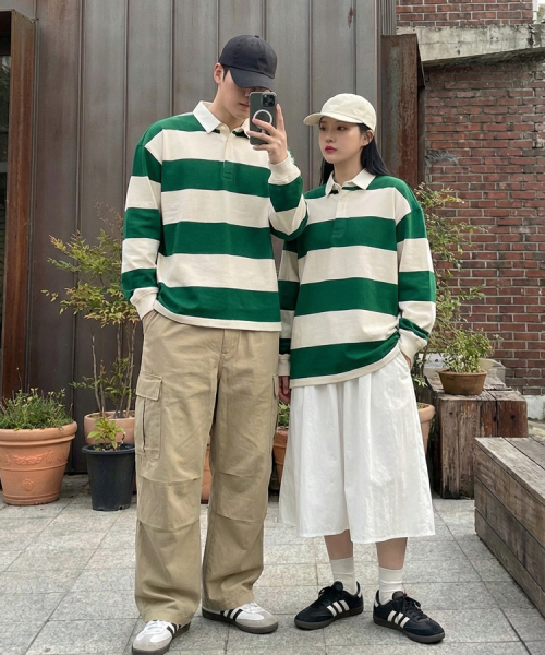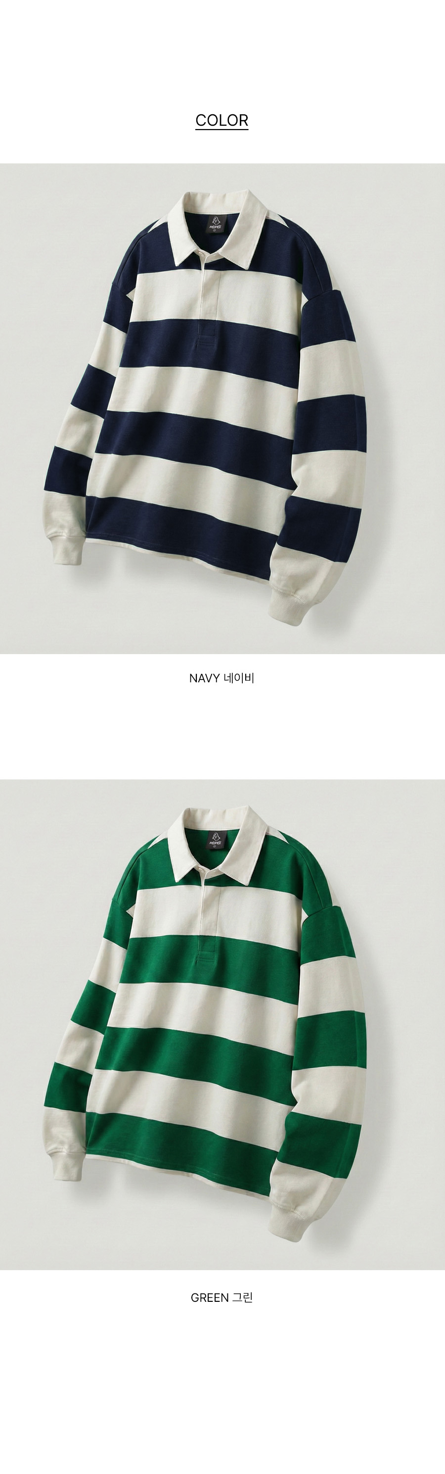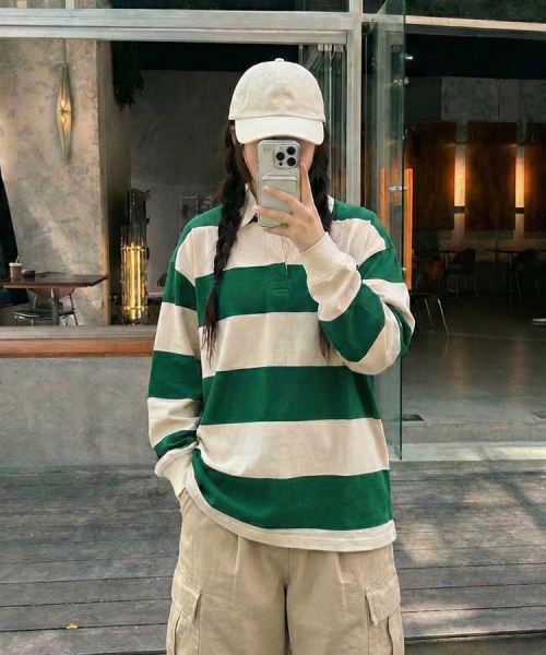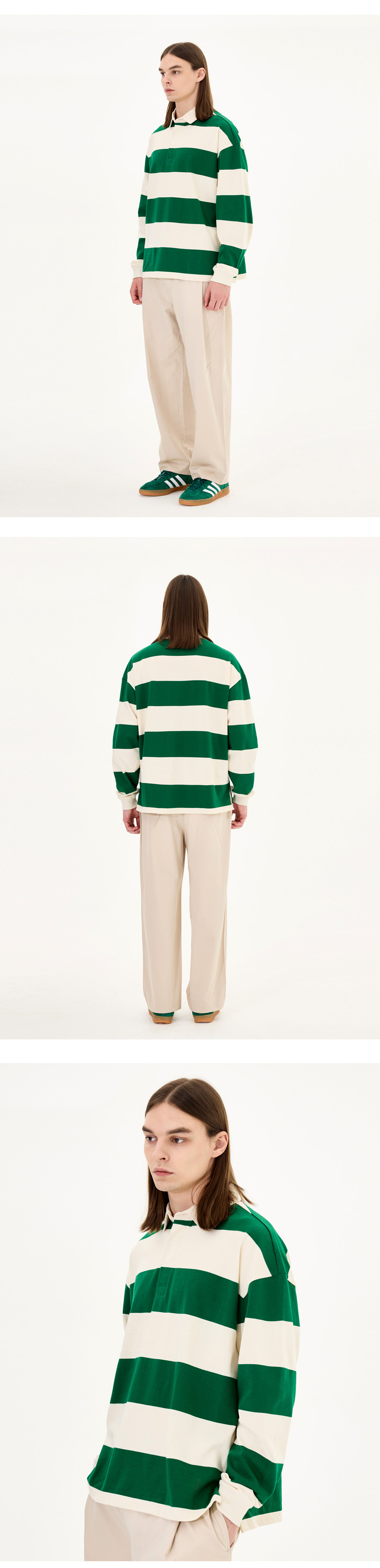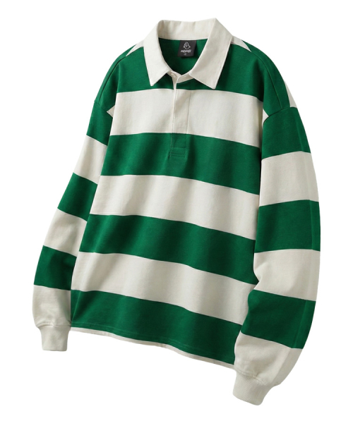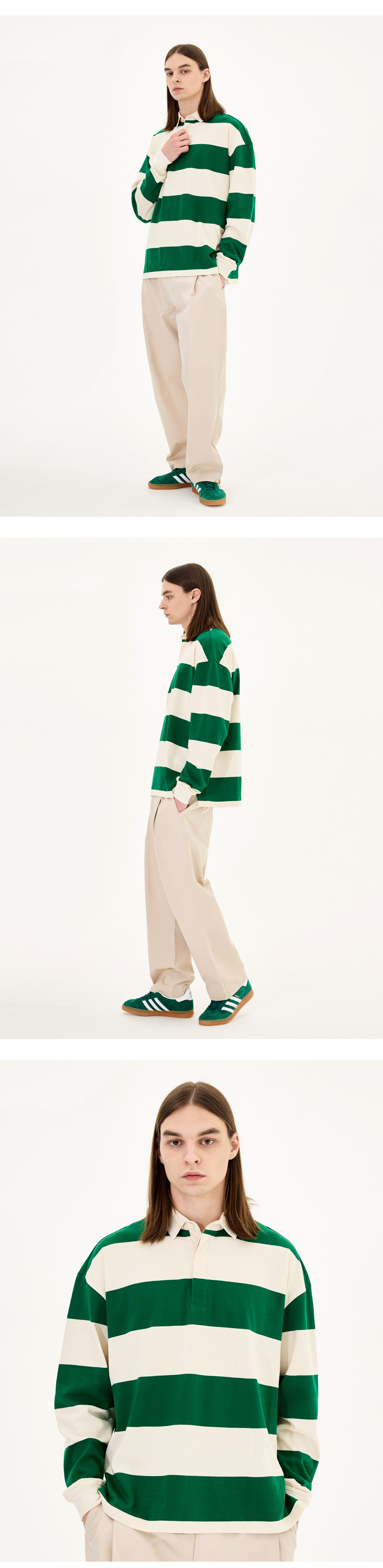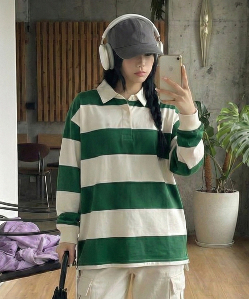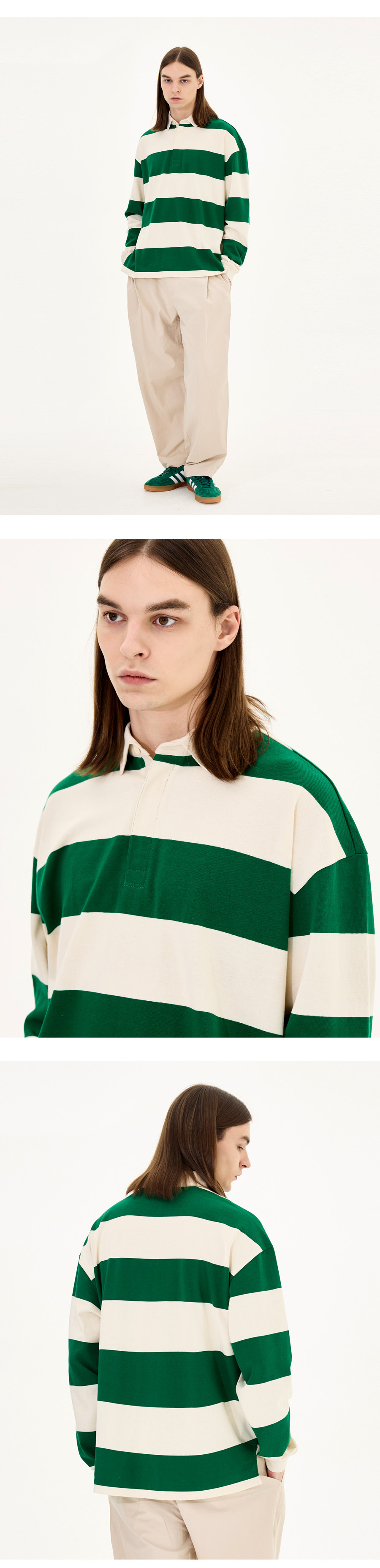 럭비 스트라이프 롱 슬리브 카라 티셔츠 그린