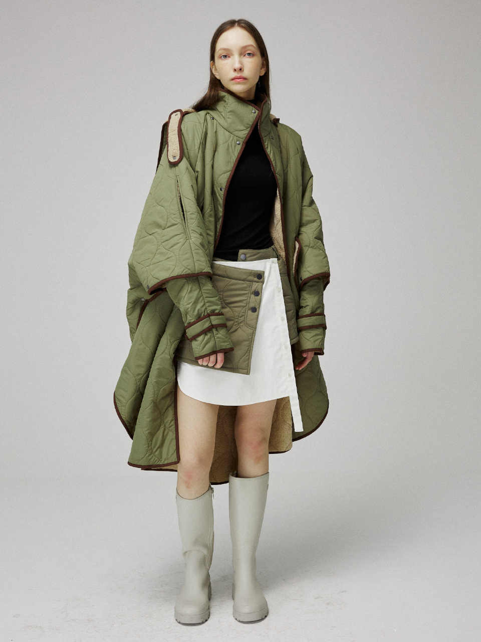 사이드의 스냅 버튼으로 착용자의 사이즈에 맞게 다양한 실루엣을 연출하실 수 있습니다.