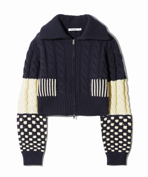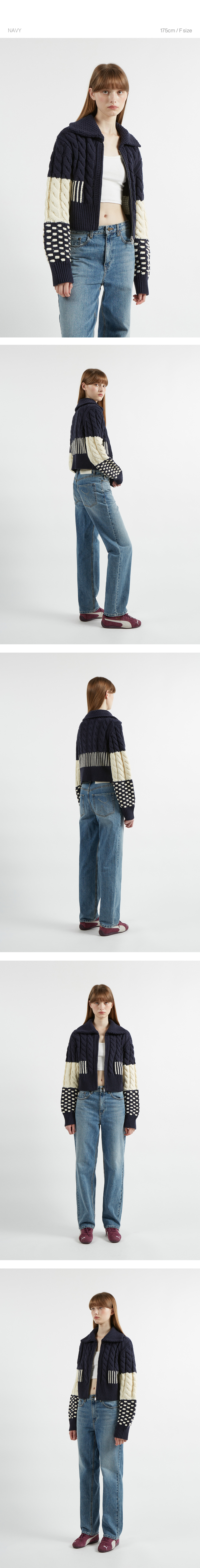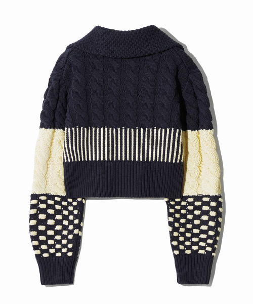 (우먼) 크롭 패치워크 니트 집업_네이비