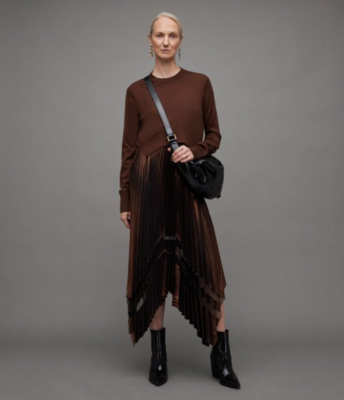 올세인츠 시그니처 2-in-1 컬렉션에 새롭게 추가된 플리츠 원피스. 하이-로우 밑단과 레이스 패널이 있는 풀 플리츠 스커트로 이루어진 원피스와, 책임 있는 방식으로 조달된 메리노 울로 만들어진 상단의 니트로 구성되었습니다. 다양한 방식으로 스타일링해보세요.