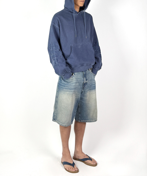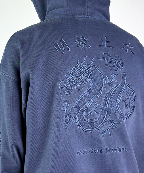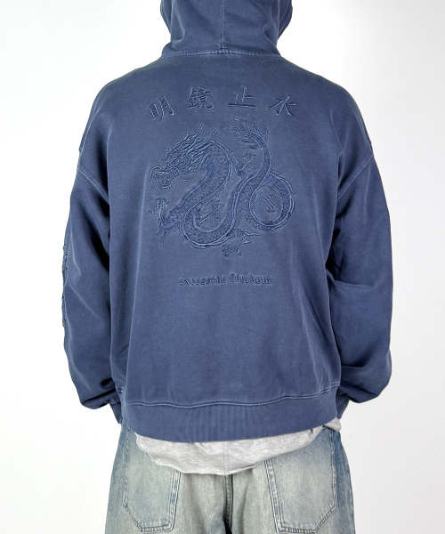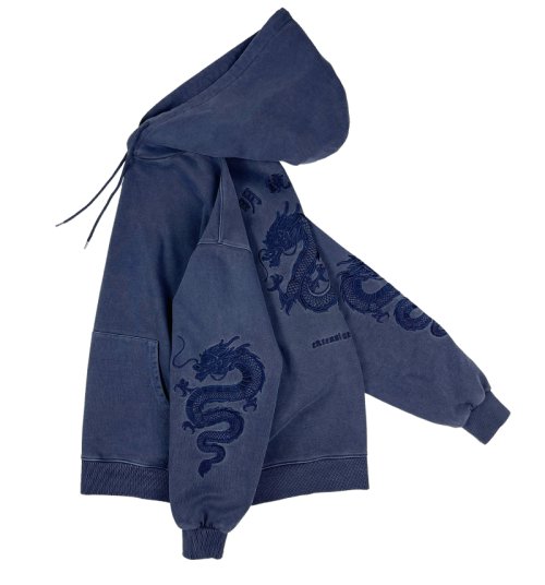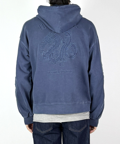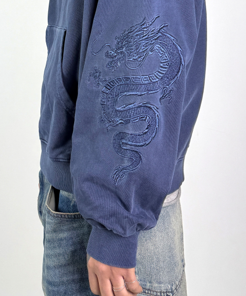 빈티지 드래곤 자수 오버핏 피그먼트 후드(워시드블루)