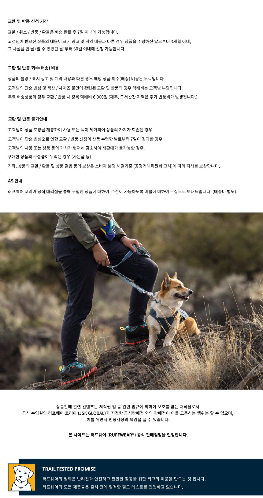 러프웨어(RUFFWEAR)는 그 이름만으로도 애견용품을 대표하는 최고급 브랜드로 미국 오리건주 밴드에 위치했습니다. 러프웨어의 철학은 개와 사람이 동료애를 느끼며 아웃도어 활동을 안전하고 편안하게 할 수 있는 최고급 아웃도어 애견용품을 만드는 것이며, 이를 위해 제품의 디자인, 소재를 그 목적에 맞게 설계/제작하고 있으며 지속적인 제품 개발을 통해 최고의 애견용품 업체로의 위상을 굳건해 하고 있습니다.